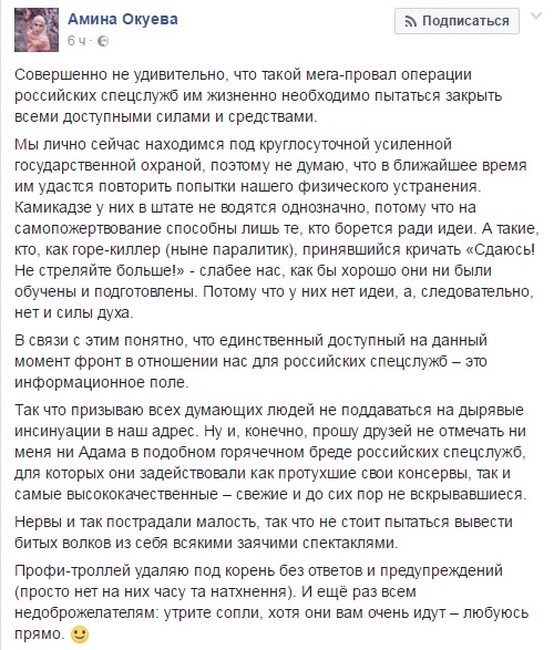 Так что призываю всех думающих людей не поддаваться на дырявые инсинуации в наш адрес. Ну и, конечно, прошу друзей не отмечать ни меня ни Адама в подобном горячечном бреде российских спецслужб, для которых они задействовали как протухшие свои консервы, так и самые высококачественные – свежие и до сих пор не вскрывавшиеся.