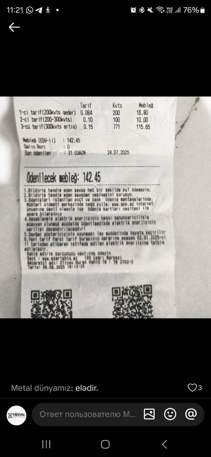 «В прошлом месяце я платил за свет 50 манатов, в этом месяце мне пришёл счёт — 105 манатов. По другому адресу я платил 110 манатов, а в этом месяце — 245 манатов. Те же самые показатели киловатт, то же количество кондиционеров, тот же объём электроэнергии. Однако в этом месяце я заплатил в два раза больше. Может, кто-то знает о повышении тарифов на свет или изменении лимитов? Не знаю. Объясните мне», — обратился блогер к общественности.