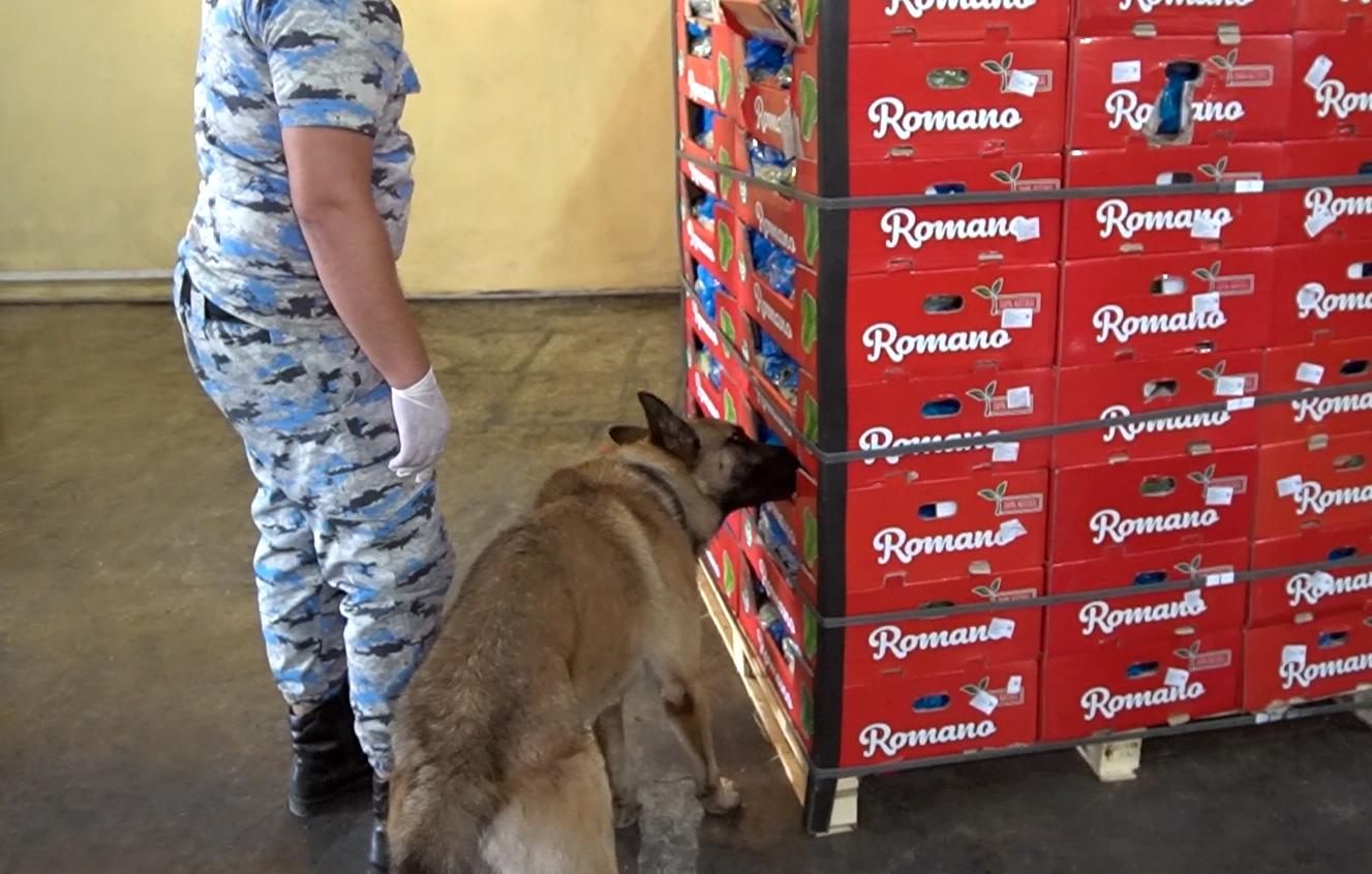 При проверке с применением служебной собаки в четырёх паллетах были выявлены 76 упаковок, спрятанных под грузом салата. Общий вес наркотика вместе с упаковкой составил около 70 кг 410 г марихуаны.