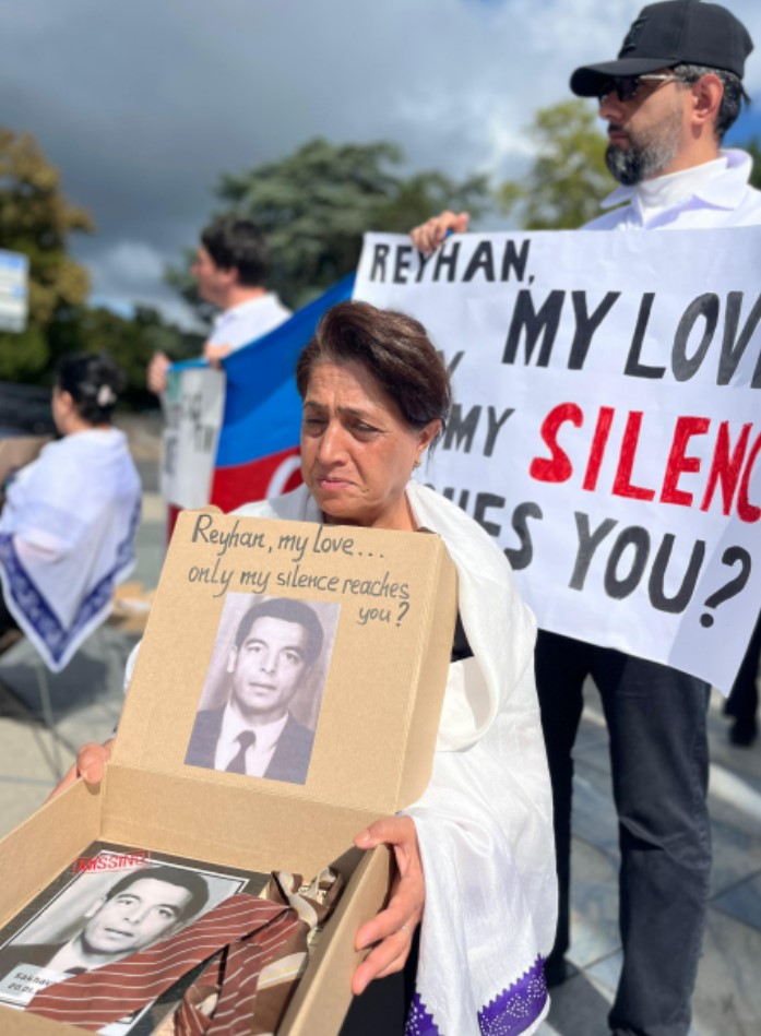 Супруга пропавшего без вести Октая Мамедова – Парвана Мамедова держала плакат со словами: «Дипломы, мечты… а взамен — безмолвие долгих лет» (Diploma, dreams… but suddenly, the silence of ages).