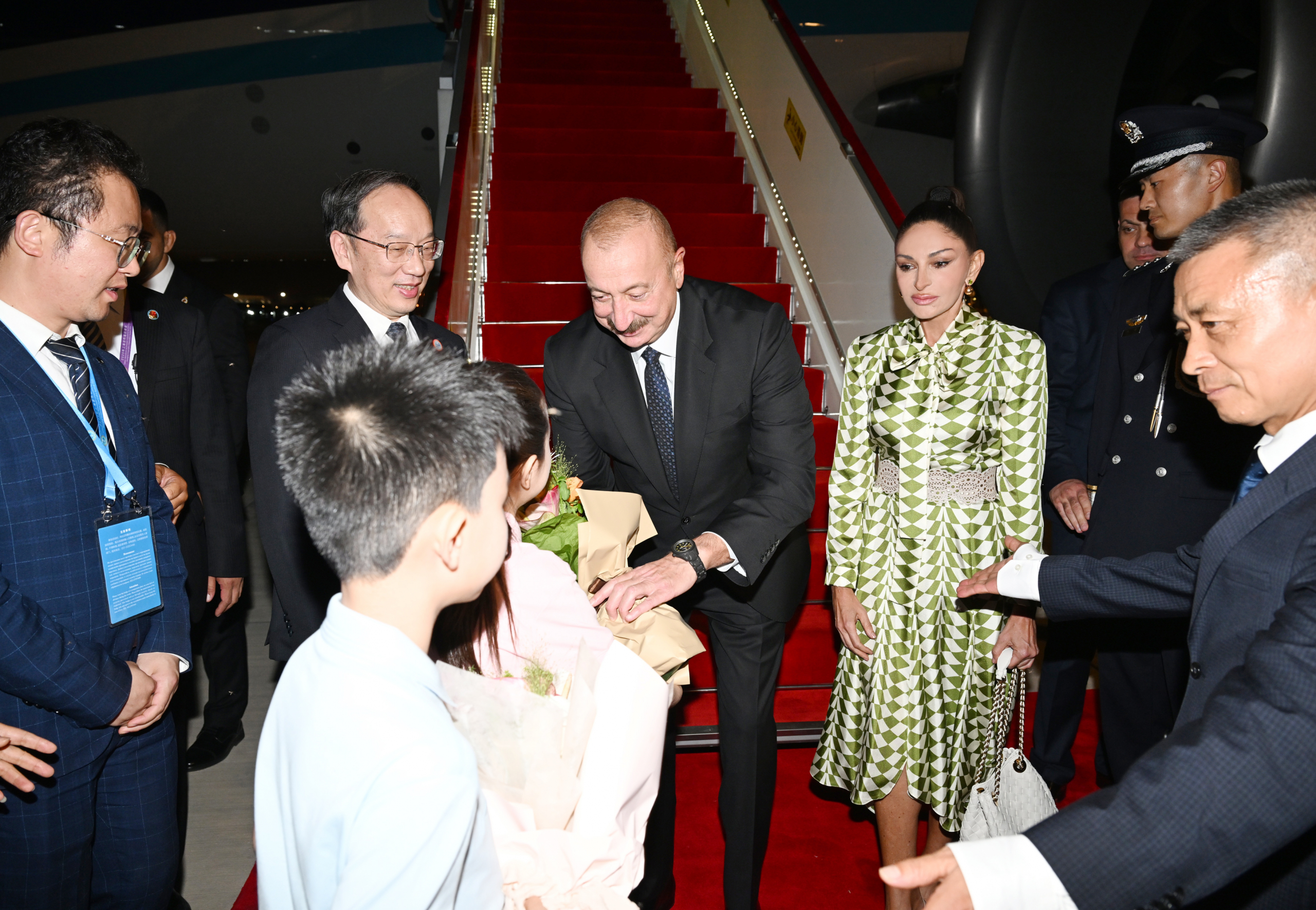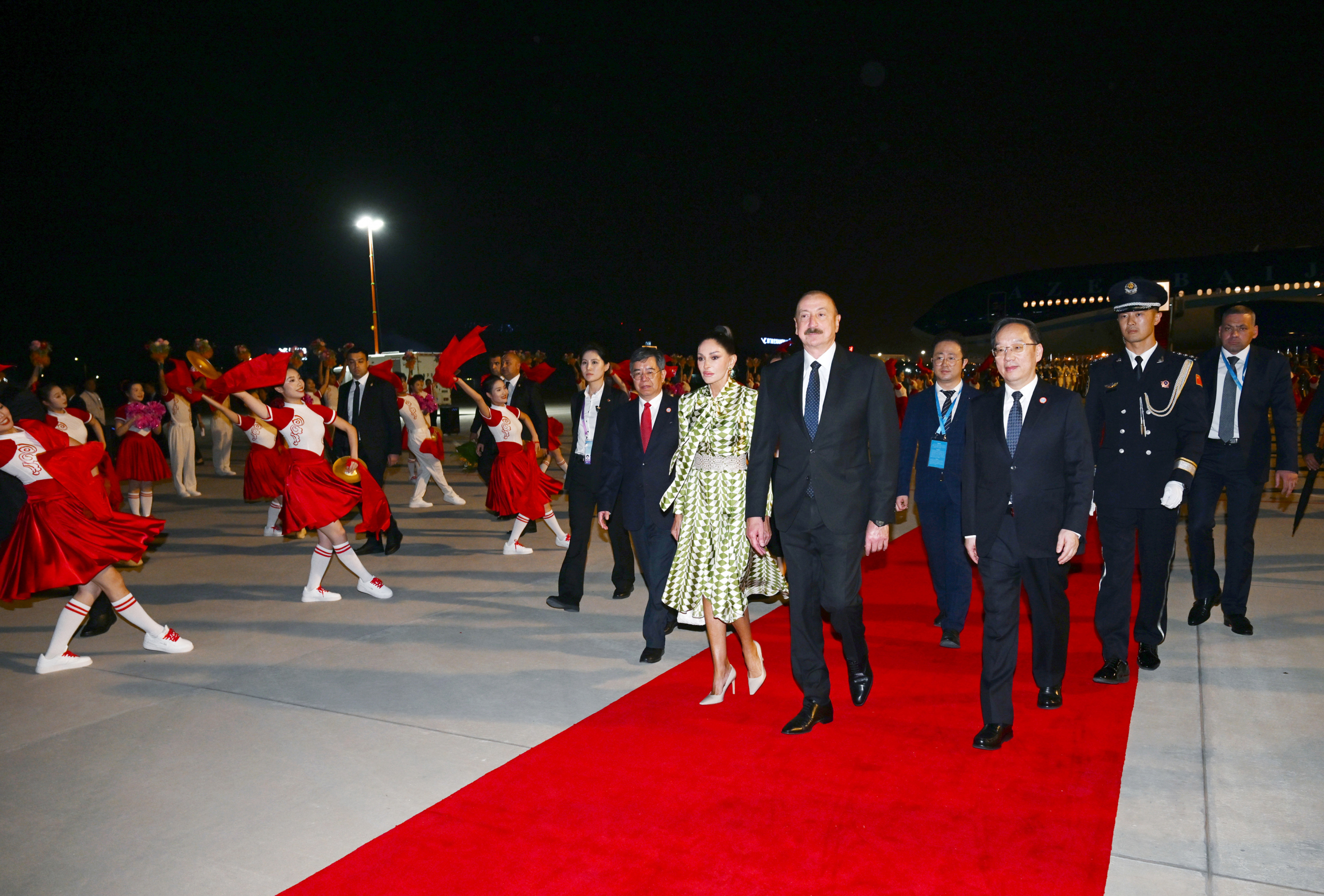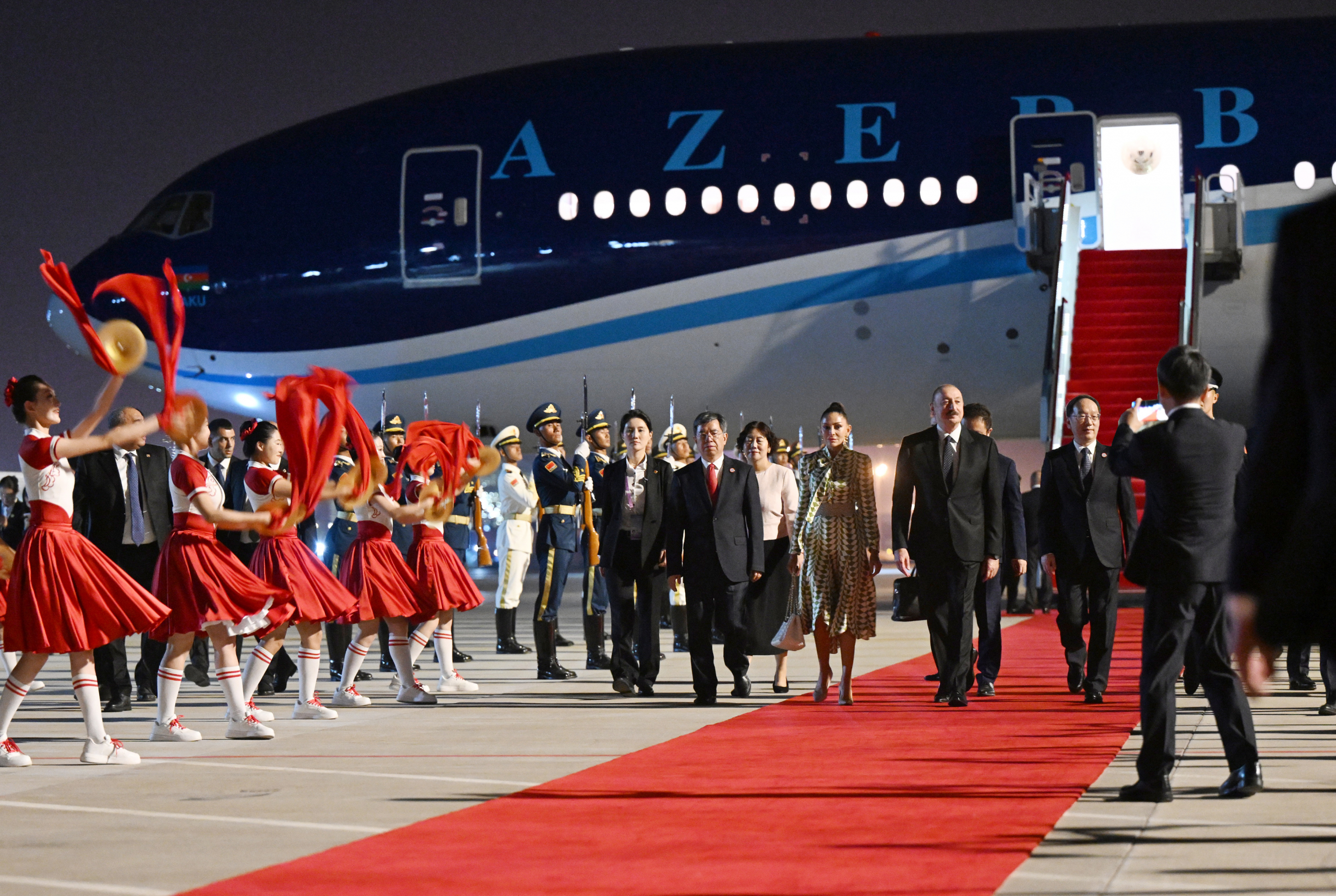 Президента Ильхама Алиева и первую леди Мехрибан Алиеву встречали министр промышленности и информационных технологий КНР Ли Лэчэн и другие официальные лица.