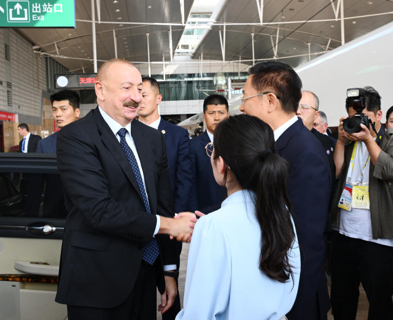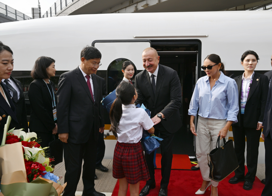 Президент Азербайджана Ильхам Алиев и первая леди Мехрибан Алиева прибыли на поезде из китайского города Тяньцзинь в столицу Пекин.