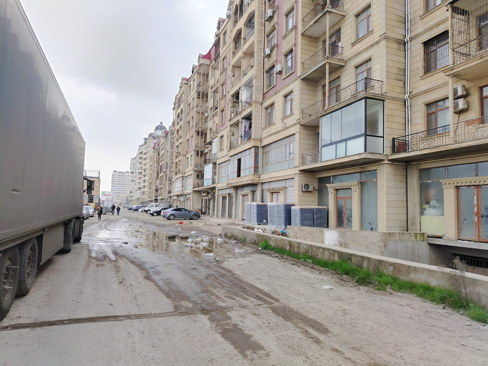 Такая же плачевная ситуация наблюдается и в районе жилого массива «Молодежный городок» (Abşeron Gənclər Şəhərciyi): отсутствуют тротуары, дети передвигаются по автотрассе или по грязи.