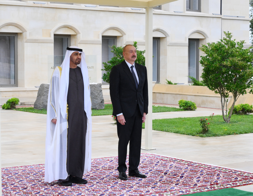 Президент Азербайджана и п ОАЭ прошли перед строем почетного караула. Прозвучали государственные гимны обеих стран.