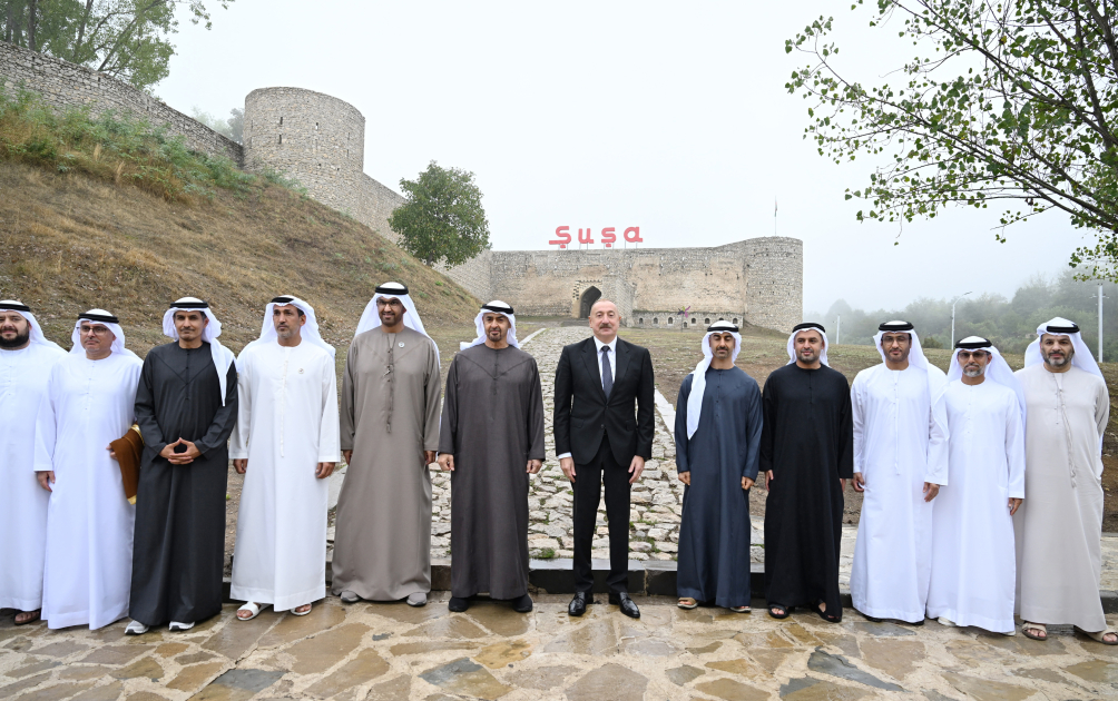 Президент Азербайджана Ильхам Алиев и президент Объединенных Арабских Эмиратов Шейх Мухаммед бен Заид Аль Нахайян сфотографировались на фоне Шушинской крепости.