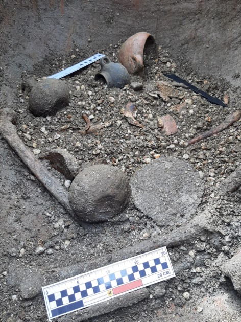 Вокруг скелета обнаружены три миниатюрных сосуда (для масла или ароматических веществ), миска из глины, множество бусин, а также золотые серьги с изображением винограда.