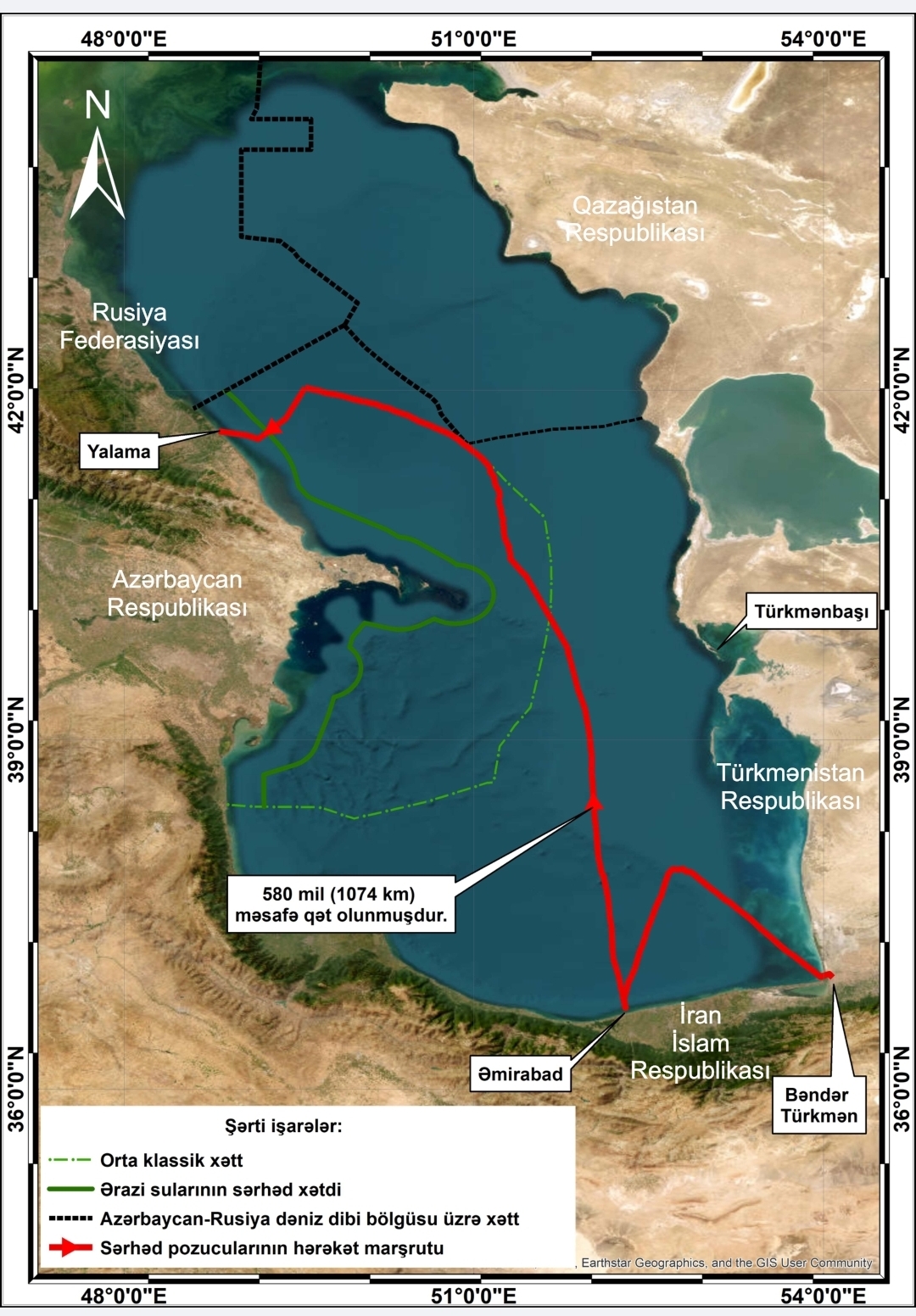 При осмотре памяти GPS-устройства марки Garmin, обнаруженного у нарушителей границы, было установлено, что они преодолели расстояние в 1074 км с территории Ирана, проходя через территориальные воды Туркменистана, и вошли на территорию Азербайджана.