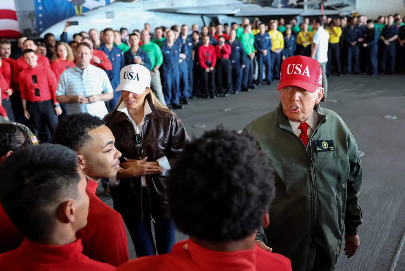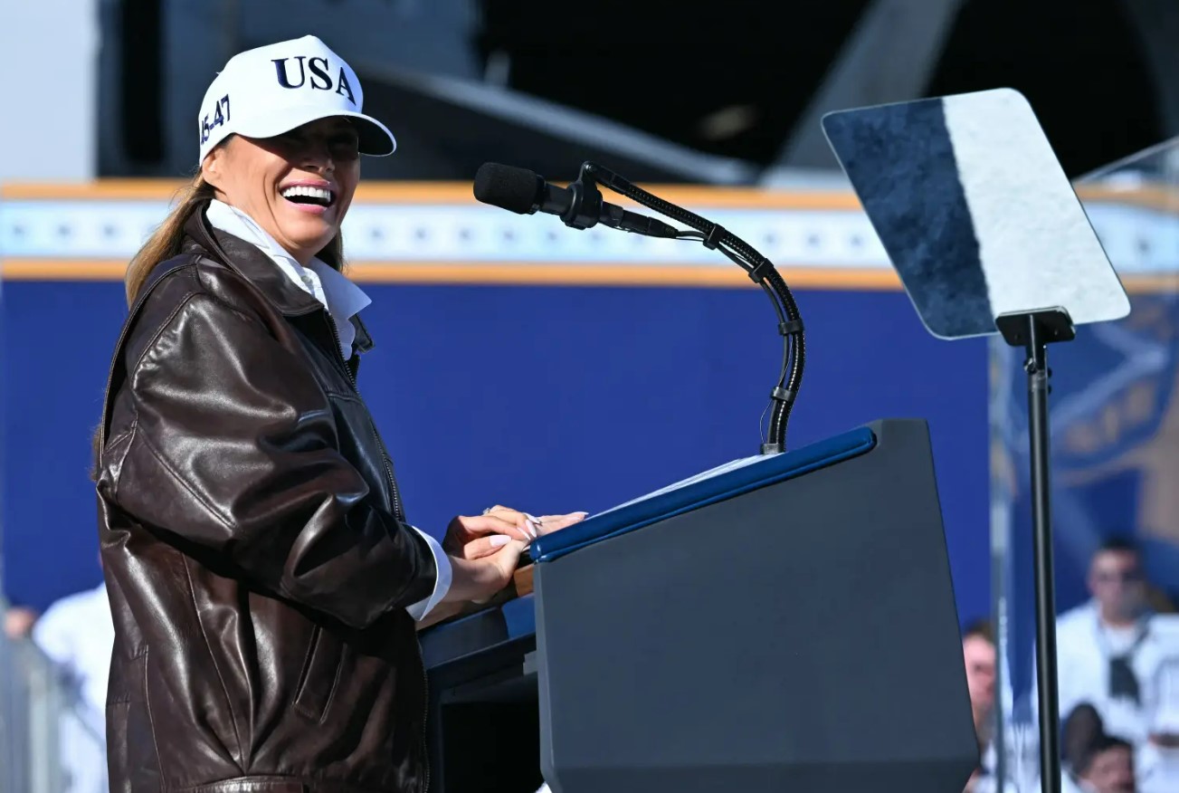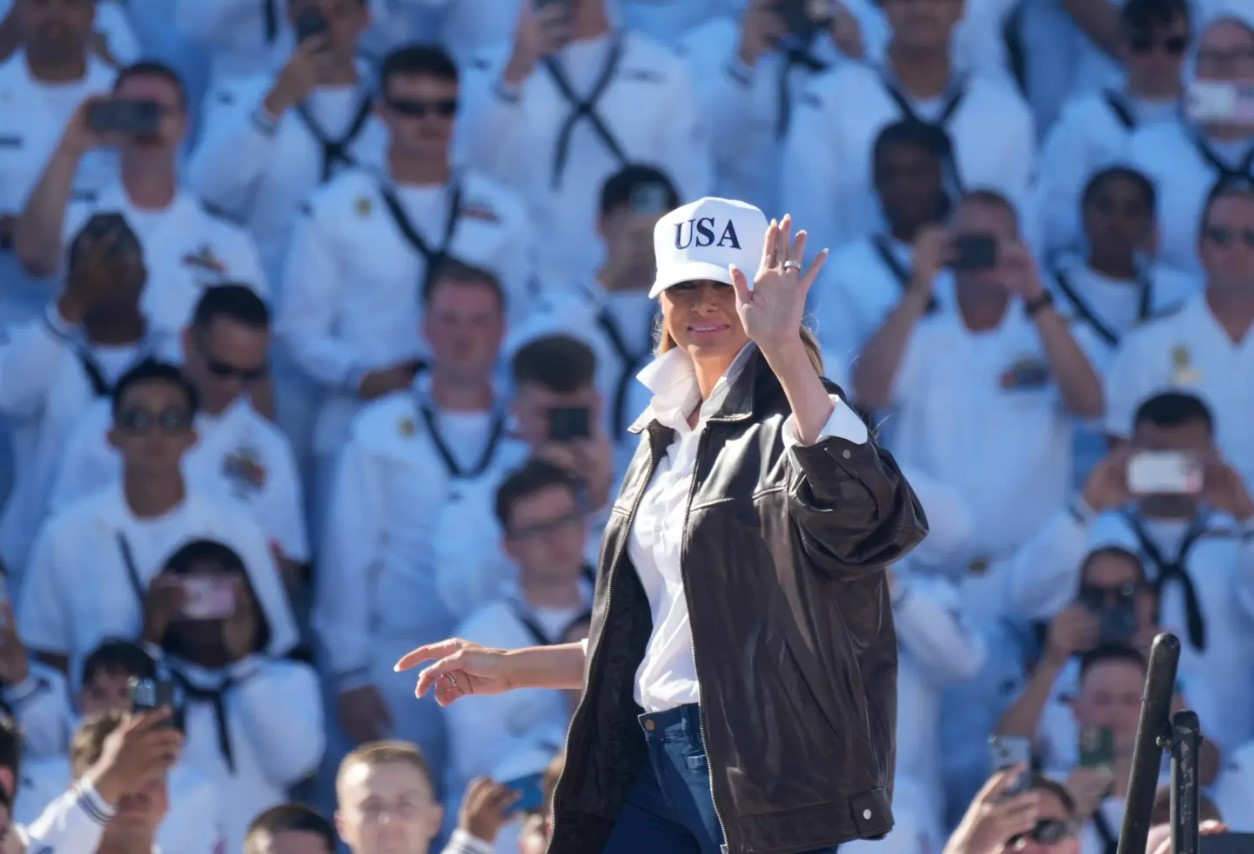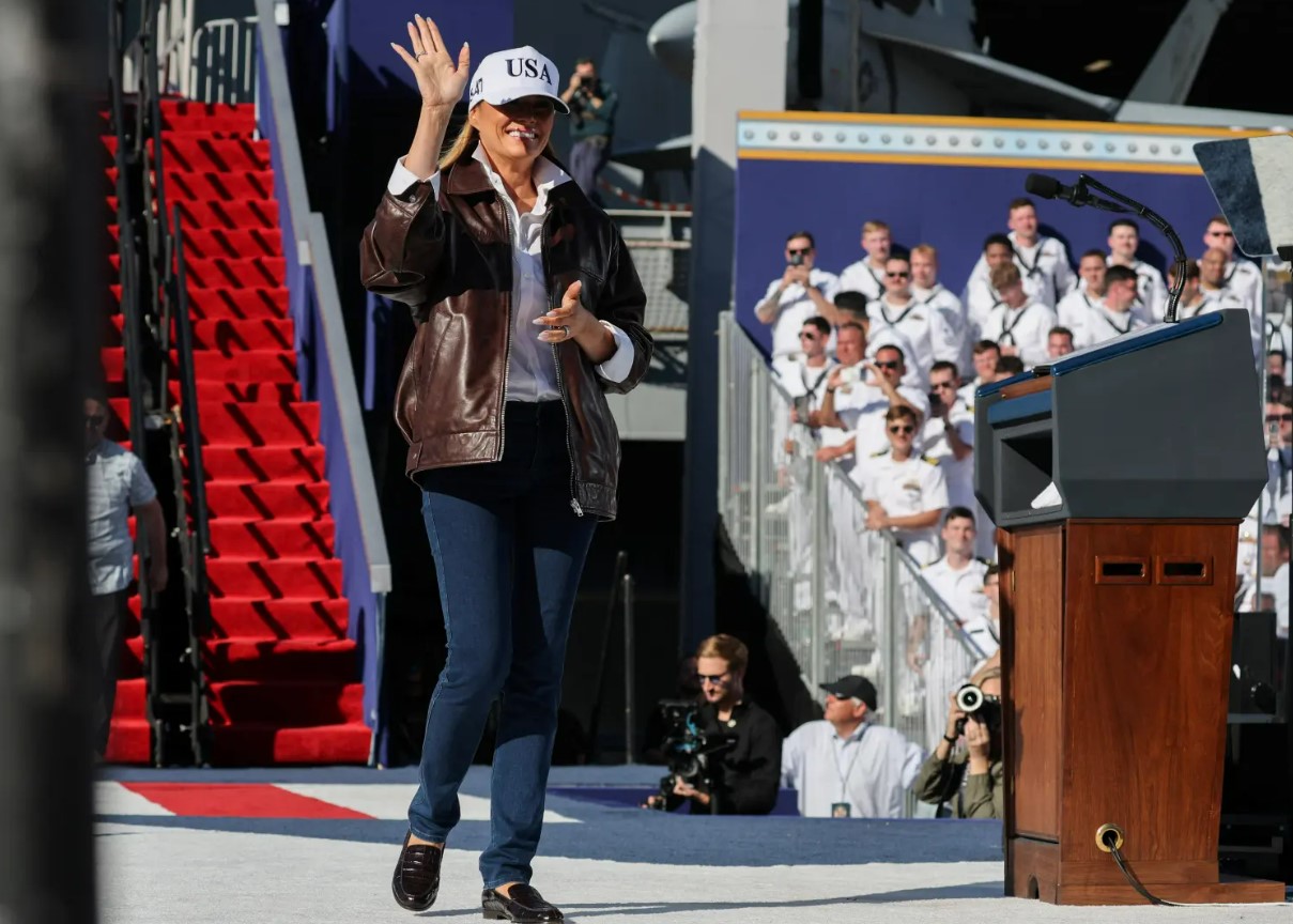 Дональд Трамп с супругой посетил торжественное мероприятие в Норфолке (штат Вирджиния), посвящённое 250-летию военно-морского флота США. Мелания появилась в белой рубашке, шоколадной кожаной куртке, облегающих джинсах синего цвета и чёрных лоферах. Образ дополнили кепка и украшения, а естественный макияж и распущенные волосы завершили стиль.