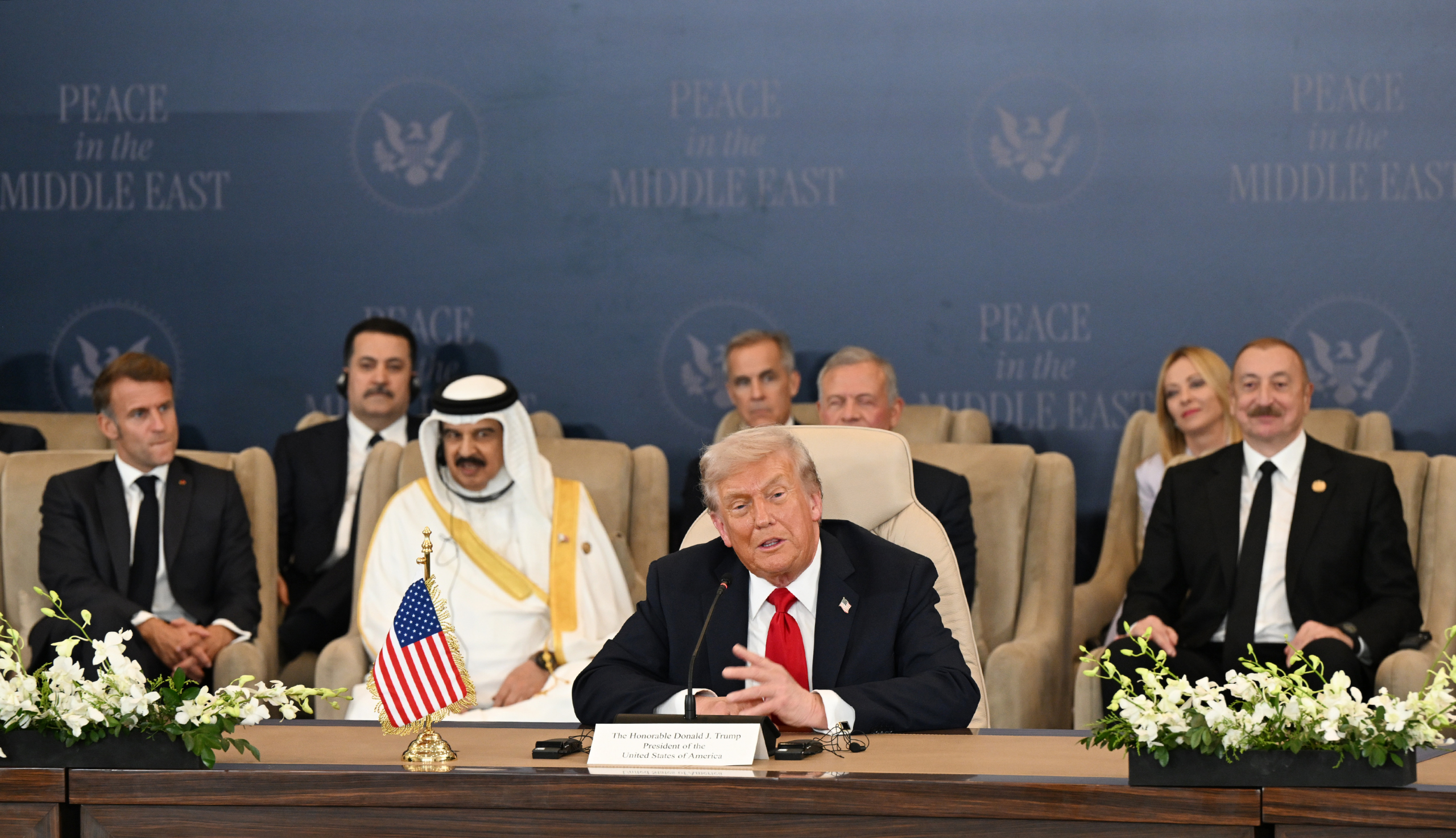 19:48 Президент США Дональд Трамп приветствует Ильхама Алиева на саммите мира по Газе.
