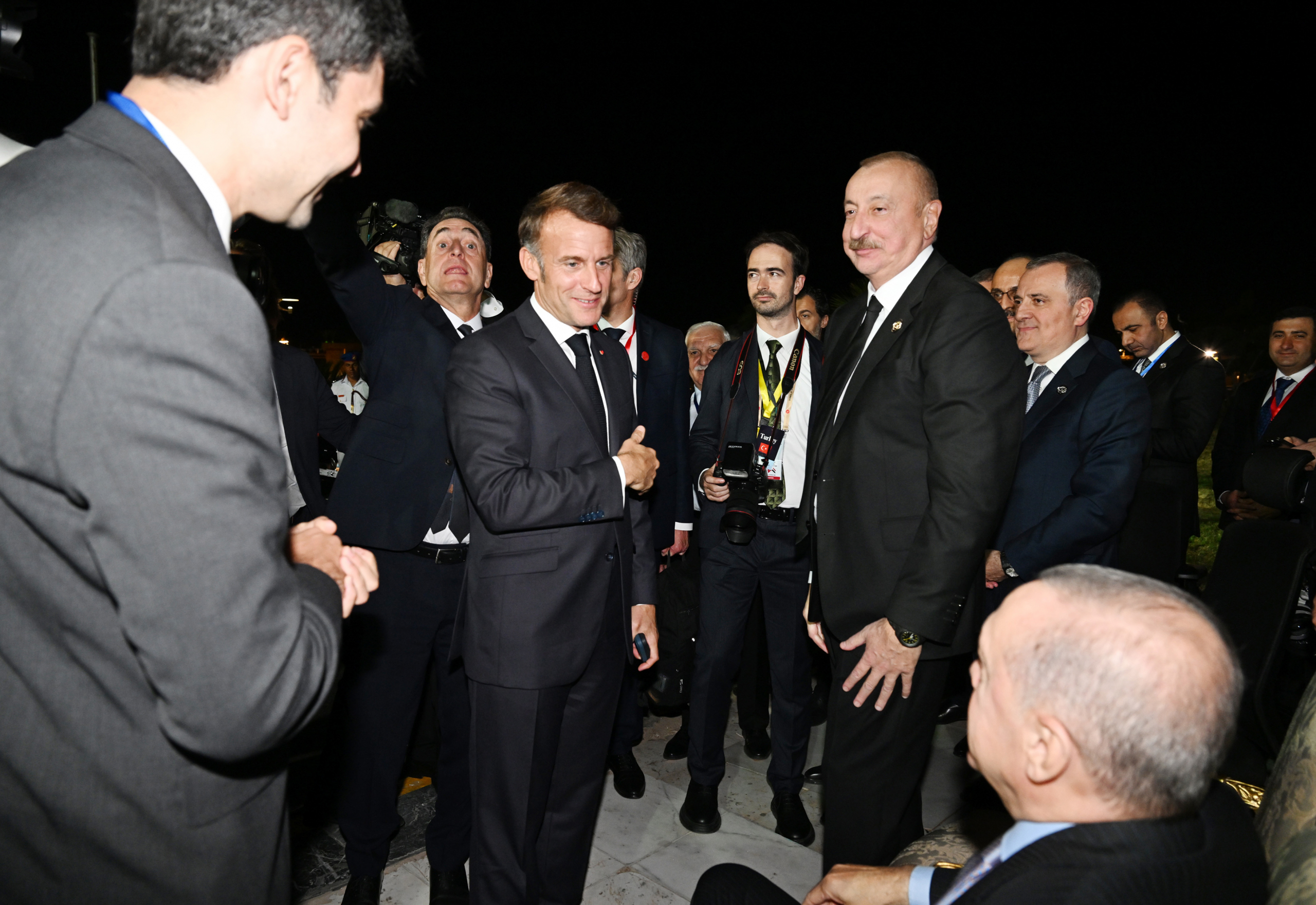 19:55 Президент Франции Эмманюэль Макрон подошел к Алиеву и тепло поприветствовал.