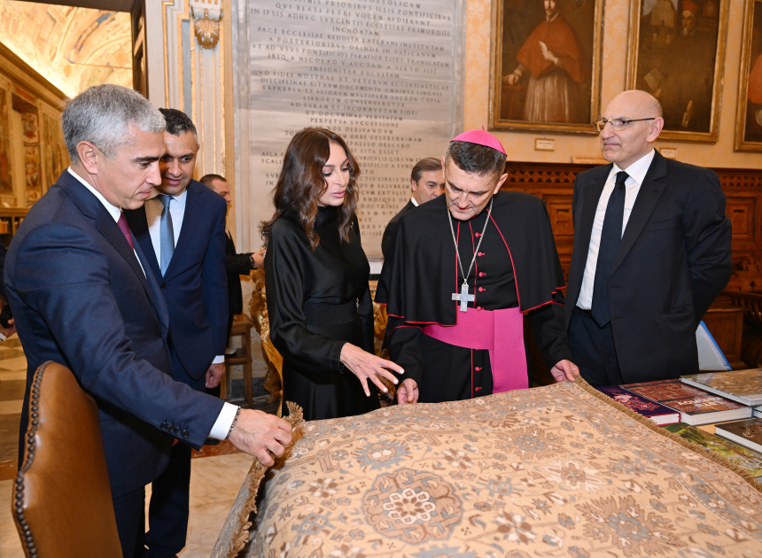 Также Мехрибан Алиева посетила Ватиканскую апостольскую библиотеку. Руководитель Апостольской библиотеки и Апостольского архива архиепископ монсеньор Джованни Чезаре Пагацци проинформировал Мехрибан Алиеву об исторических рукописях и исторических источниках, отреставрированных и оцифрованных в рамках недавно подписанного Меморандума о взаимопонимании между Фондом Гейдара Алиева, Национальной академией наук Азербайджана, Апостольской библиотекой Ватикана и Апостольским архивом Ватикана.