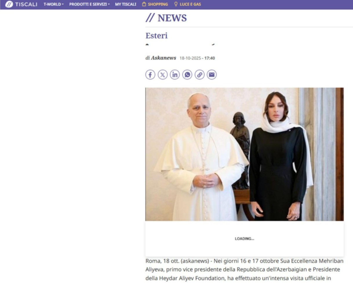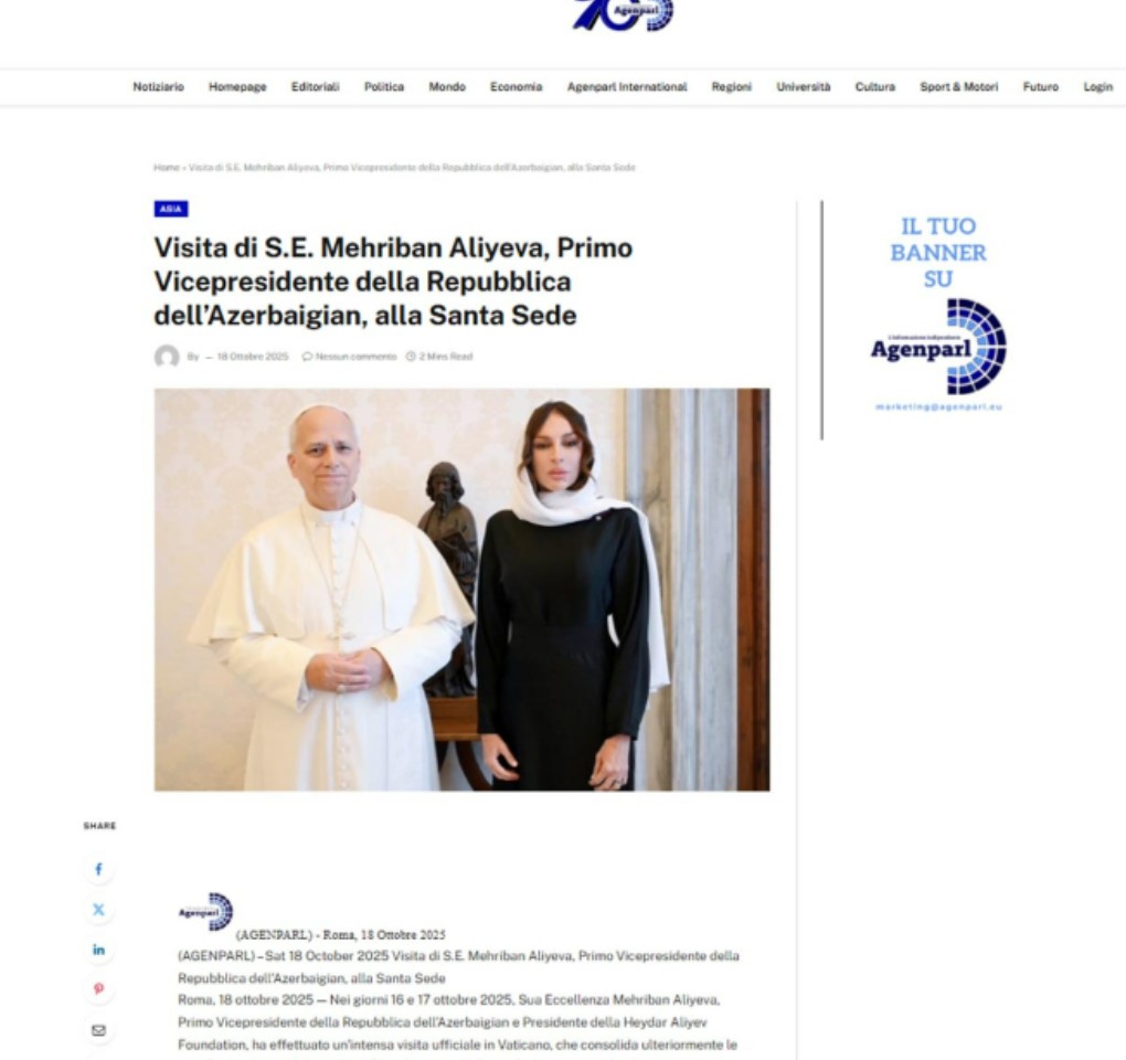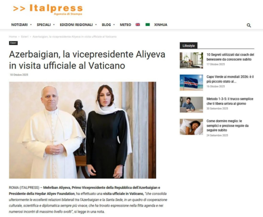 В статьях также отмечается, что первый вице-президент Мехрибан Алиева встретилась с президентом Губернаторства Государства-Города Ватикан монахиней Раффаэллой Петрини и вместе с ней приняла участие в церемонии посадки деревьев в садах Ватикана, ознакомилась с реставрационными работами, проводимыми в соборе Святого Петра в Ватикане при поддержке Фонда Гейдара Алиева, посетила Апостольскую библиотеку и Апостольский архив Ватикана, а также совместно с государственным секретарем Ватикана кардиналом Пьетро Паролином приняла участие в официальном открытии административного офиса посольства Азербайджана в Святом Престоле.