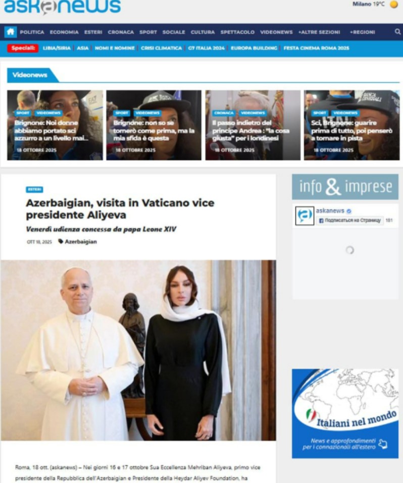 В материалах, опубликованных информационными агентствами Askanews и Italpress, а также порталами Agenparl и Notizie Tiscali, говорится о том, что визит первого вице-президента Мехрибан Алиевой запомнился насыщенной повесткой дня и многочисленными встречами на высоком уровне, он проходил на фоне дальнейшего укрепления безупречных двусторонних отношений между Азербайджаном и Ватиканом, а также активизации культурного, научного и дипломатического сотрудничества.