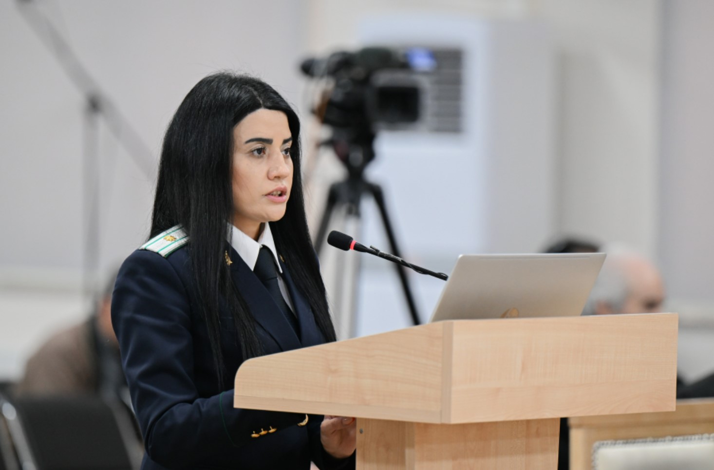 Прокурор Вюсал Абдуллаев, поддерживающий государственное обвинение, огласил части обвинительного выступления по фактам насильственного исчезновения людей, взятия в плен и заложников и применения к ним пыток в период агрессивной войны, минирования территорий, продолжения агрессии путем подрыва мин, террористических преступлений, совершенных в период агрессивной войны и фактам использования наемников.
