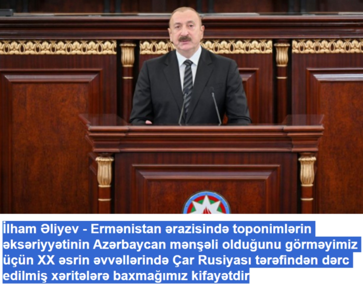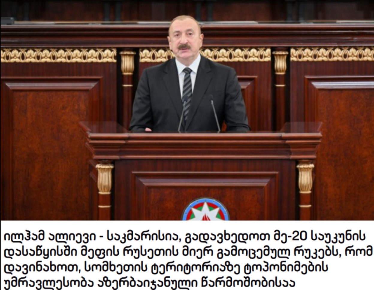 В материале, опубликованном на 1Tv.ge, отражены взгляды президента Ильхама Алиева касательно топонимов на территории Армении. В цитате, приведенной из выступления президента Азербайджана, говорится: «Достаточно взглянуть на карты, изданные царской Россией в начале XX века, чтобы каждый мог убедиться, что абсолютное большинство топонимов на территории нынешней Армении имеют азербайджанское происхождение. На этих картах нет озера под названием Севан. На них есть озеро Гёйча, и там нашли отражение все остальные исторические топонимы, которые мы используем. Эти карты составляли не мы, поэтому никто не может сказать, что мы занимаемся здесь фальсификацией. Они составлены царской Россией. Той самой царской Россией, которая некогда переселила армян из Ирана и Восточной Анатолии на нашу Карабахскую землю, чтобы изменить здесь этнический и религиозный состав населения. То есть эти карты полностью основаны на исторических реалиях».