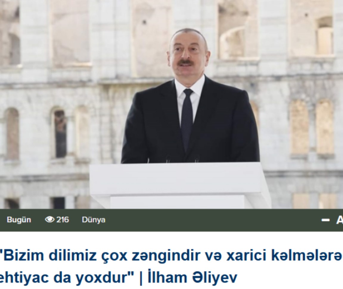«Я регулярно знакомлюсь с ситуацией в различных регионах, где проживают азербайджанцы, держу ее в центре внимания, принимаю необходимые меры. Вижу, что в некоторых местах наш литературный язык утрачивается среди азербайджанцев, проживающих в других странах. Вижу, что в некоторых местах наш литературный язык утрачивается среди азербайджанцев, проживающих в других странах. Он больше используется как бытовой язык, полон иностранных слов. Поэтому если мы не будем беречь свой язык, если мы не будем сохранять его чистоту, то можем постепенно утратить его. Для каждой нации, каждого народа его родной язык является главным фактором национальной принадлежности, и все общественные активисты, все общество должны бить в одну точку в этом вопросе. Наш язык древний. Сохранение чистоты азербайджанского языка должно быть делом каждого гражданина Азербайджана. То есть государство, ученые, лингвисты, писатели, поэты, журналисты, все, кто занимается политикой, должны уделять большое внимание этому вопросу», — говорится в цитате, приведенной из выступления президента Ильхама Алиева.
