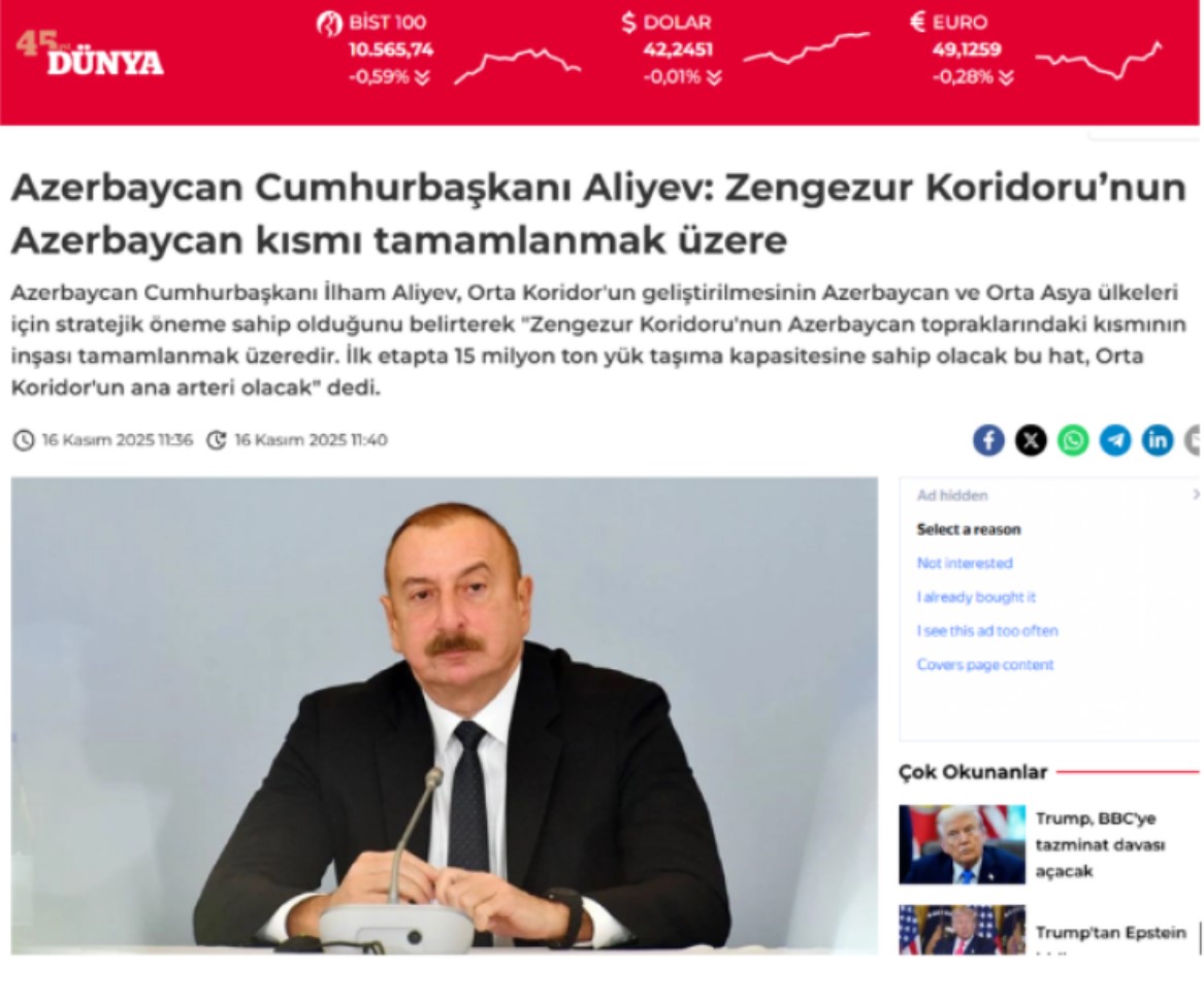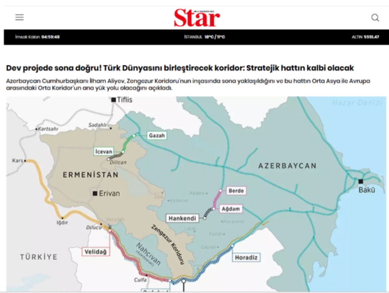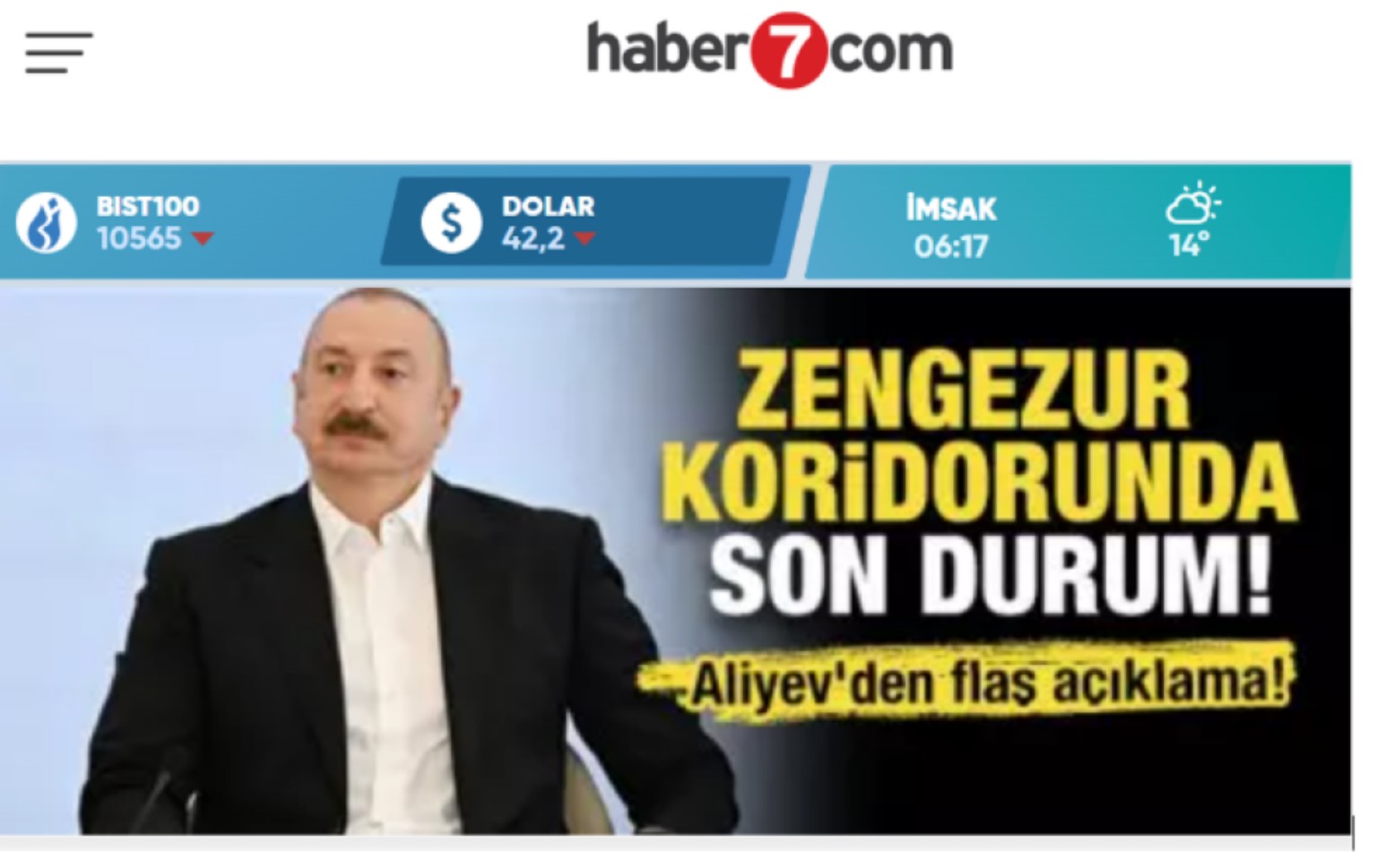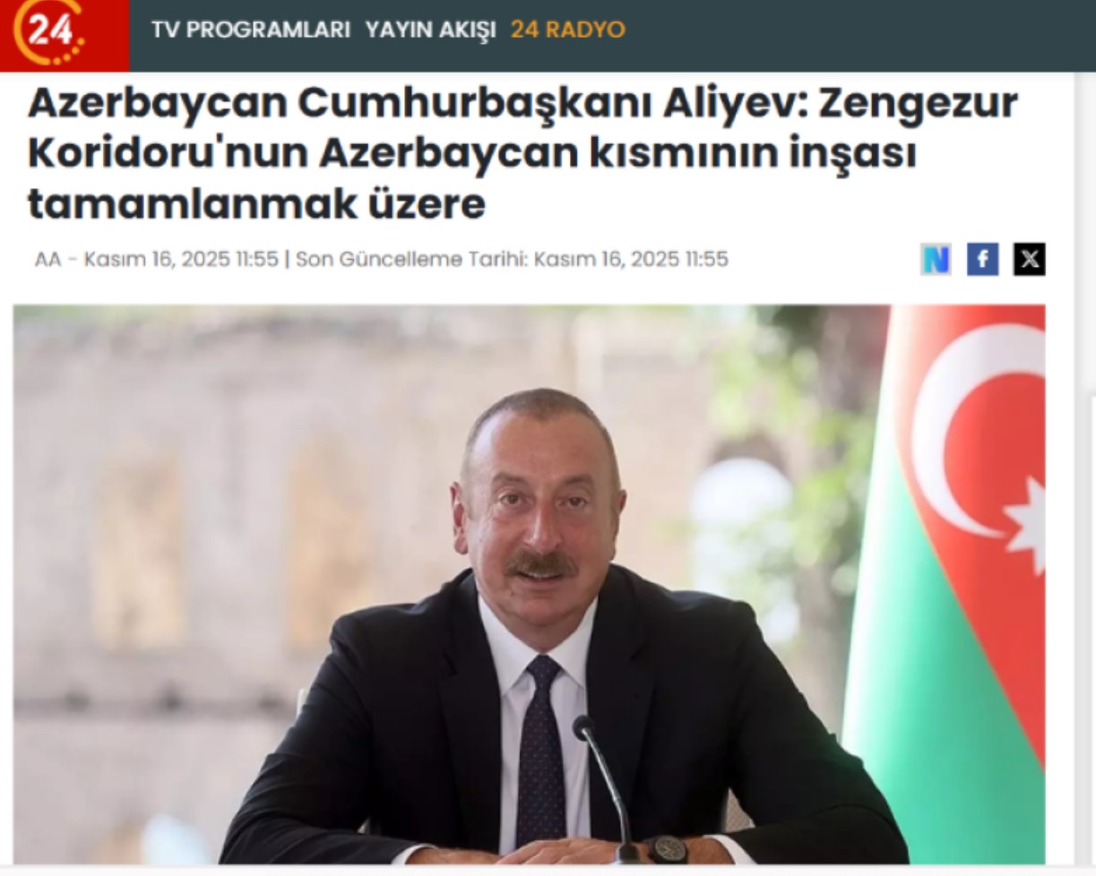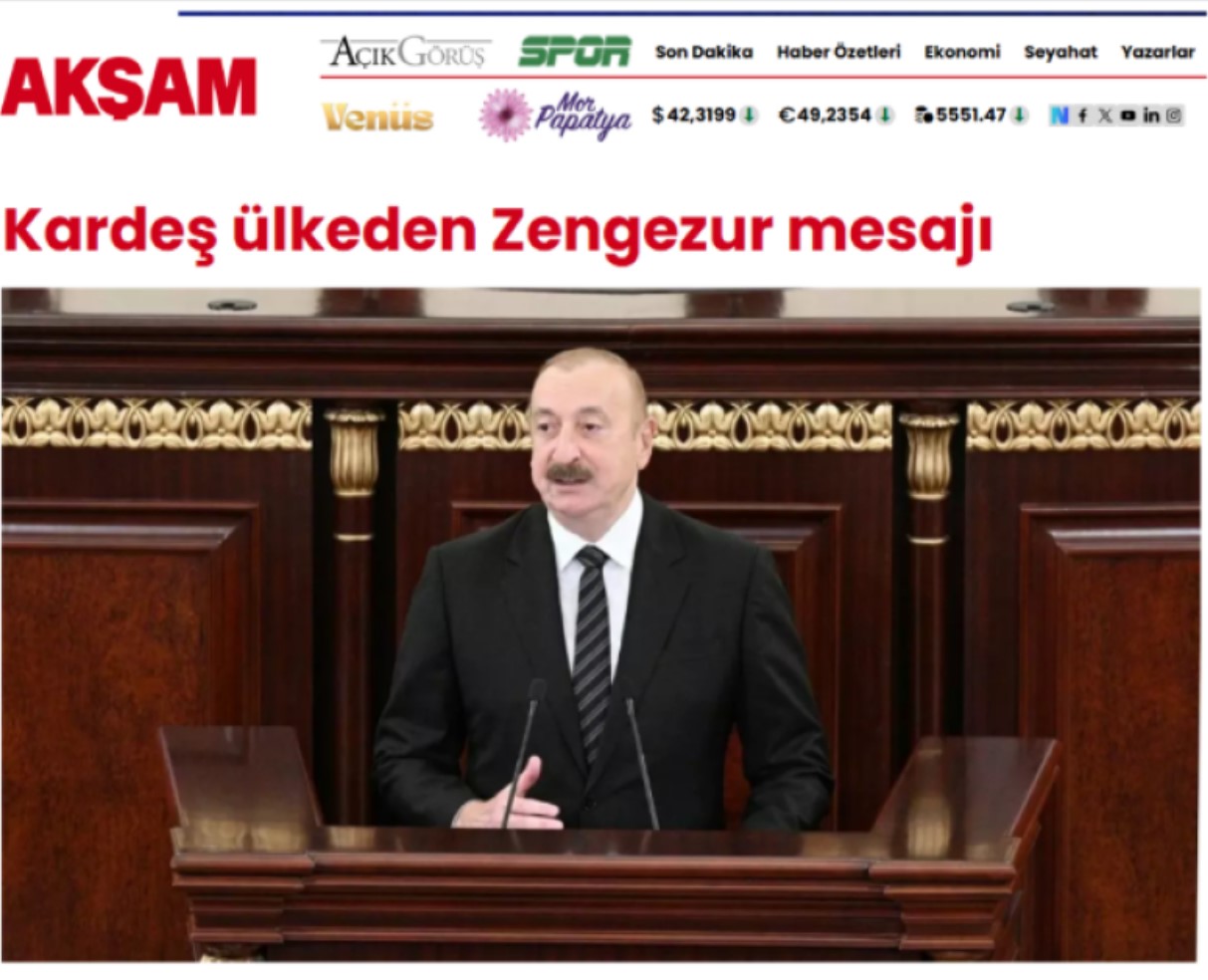 Медиаструктуры братской страны в воскресных репортажах акцентировали внимание на выступлении азербайджанского лидера перед участниками заседания, в том числе на его словах относительно проекта Зангезурского коридора (Маршрут Трампа для международного мира и процветания, TRIPP).