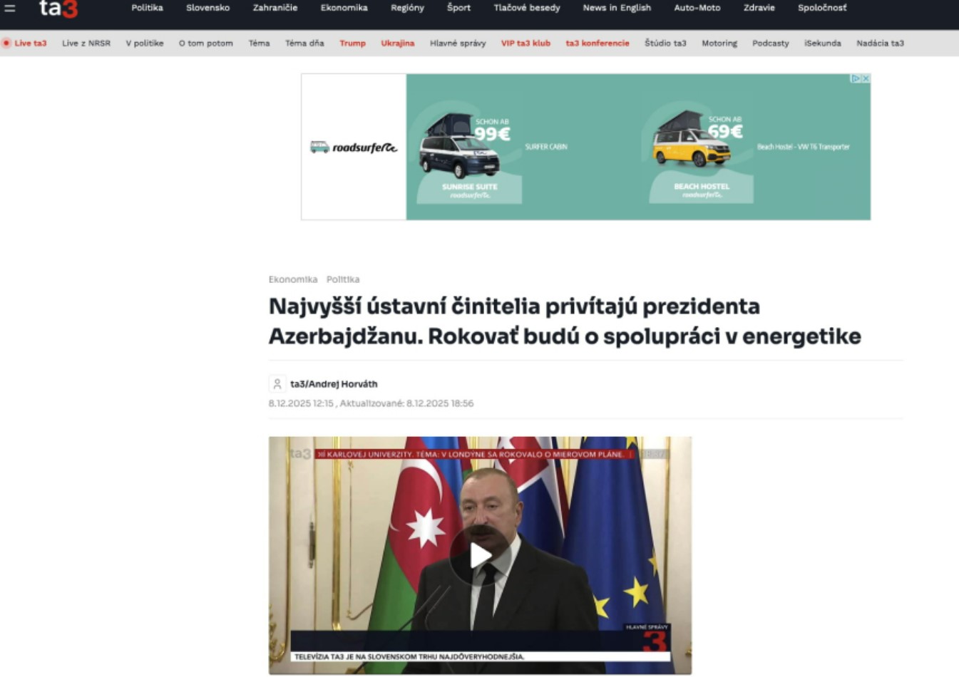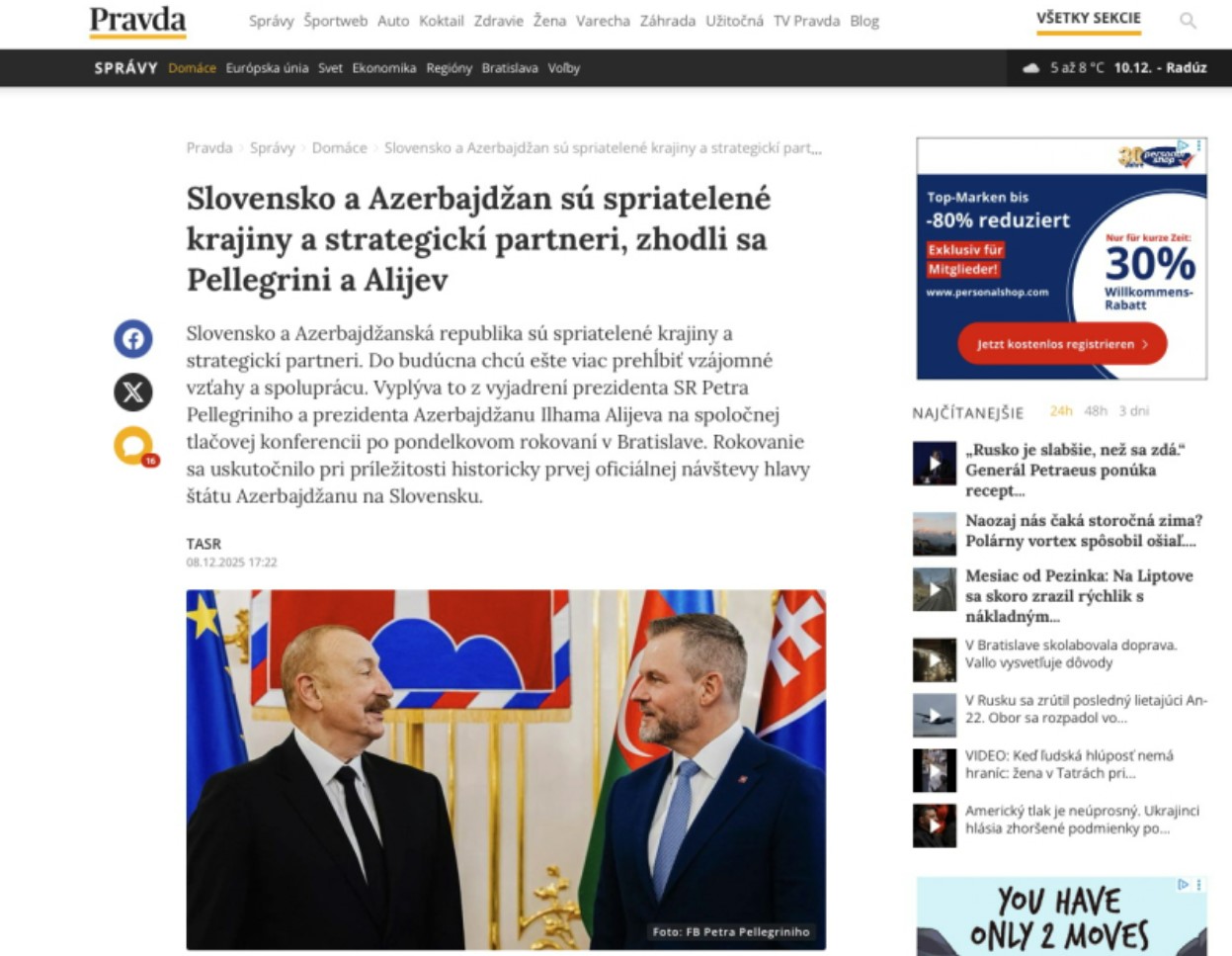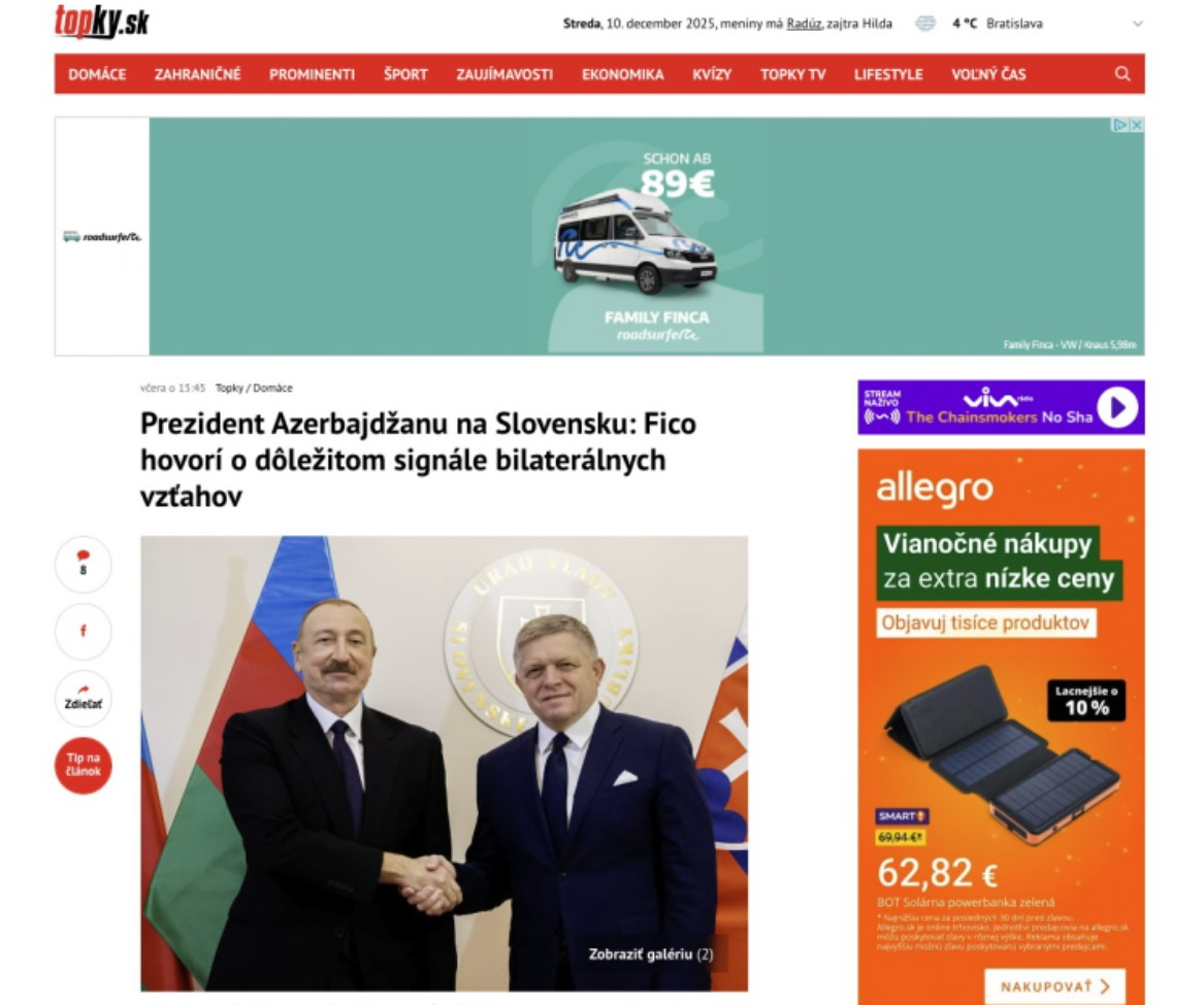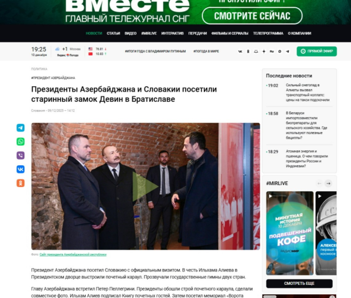 В материалах также отдельно подчёркивается поездка президента Азербайджана Ильхама Алиева и Президента Словакии Петера Пеллегрини в исторический замок Девин в Братиславе.