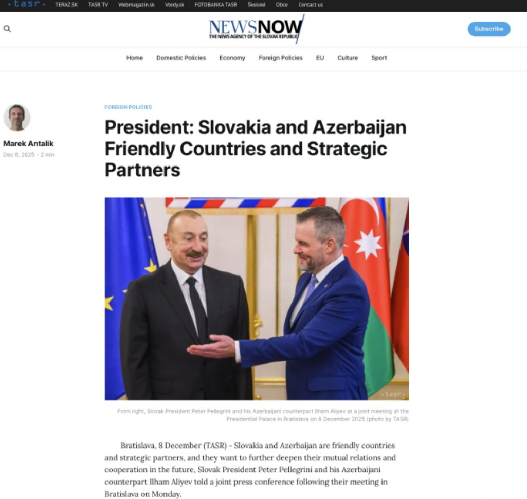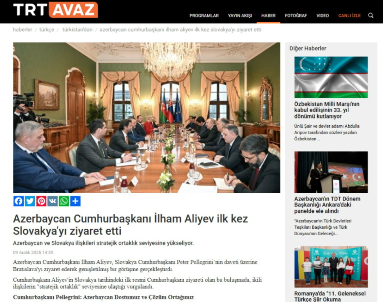 В материале, опубликованном на сайте TRT Avaz под заголовком «Азербайджан — Словакия: отношения повышаются до уровня стратегического партнёрства», сообщается, что на встречах обсуждались возможности сотрудничества в сфере энергетической безопасности, оборонной промышленности, транспорта, а также восстановления Агдамского района на основе концепции «умного села». Подчёркивается, что президент Пеллегрини отметил роль Азербайджана как долгосрочного стратегического партнера, а Президент Алиев выразил готовность расширить поставки газа и реализовывать новые оборонные и инфраструктурные проекты, объединяя словацкие технологии и финансовые возможности Азербайджана.