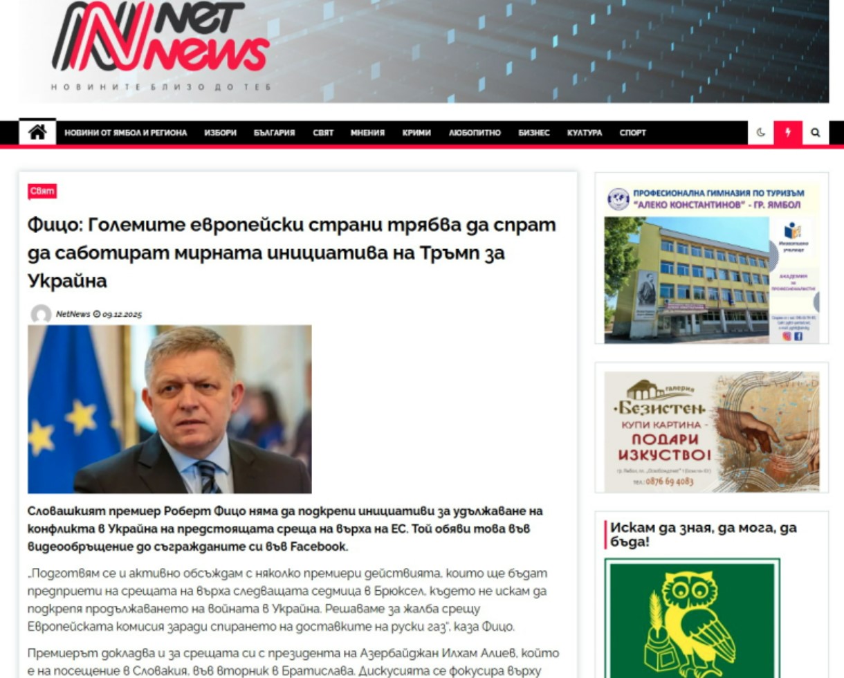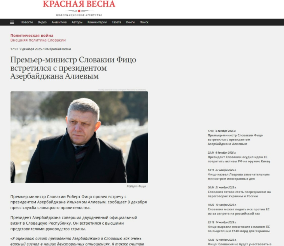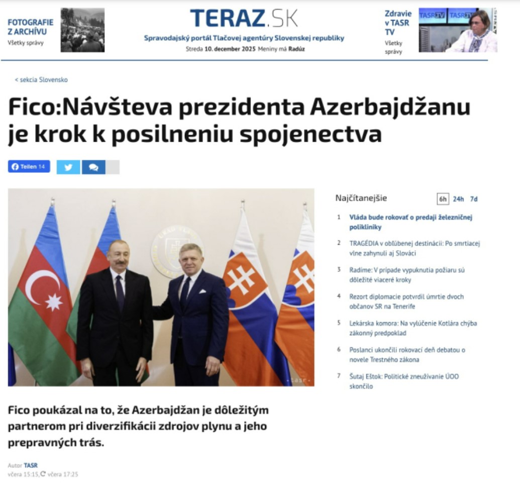 В статье, опубликованной на болгарском сайте Factibg.com, указывается, что на встрече премьер-министра Словакии Роберта Фицо с президентом Азербайджана Ильхамом Алиевым обсуждались перспективы сотрудничества в сфере газовых поставок и оборонной промышленности. Отмечается, что Словакия также планирует укреплять военное партнёрство с Азербайджаном.