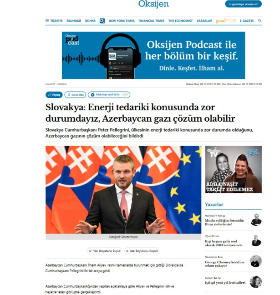 В статье, опубликованной в газете Oksigen, отмечается, что на встрече президента Ильхама Алиева с президентом Петером Пеллегрини обсуждались стратегическая роль Азербайджана в обеспечении энергетической безопасности и перспективы совместных проектов в сфере оборонной промышленности. Лидер Словакии подчеркнул ведущую роль Азербайджана в диверсификации энергетических источников своей страны и обратил внимание на возможности продажи совместно производимой оборонной продукции в третьи страны.