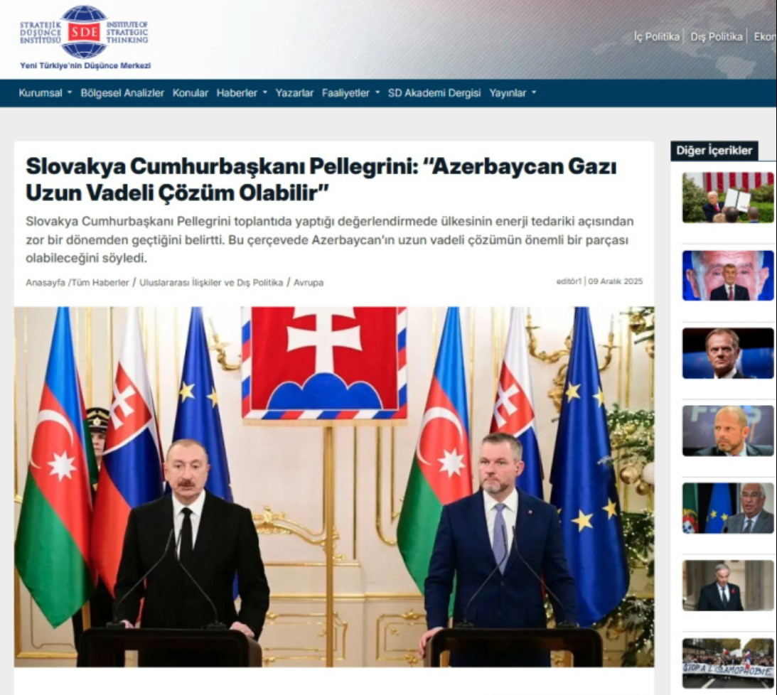 Турецкие СМИ также распространили материалы о визите президента Ильхама Алиева. В статье, опубликованной на сайте Института стратегического мышления Турции, отмечается, что на встрече Президента Ильхама Алиева с его словацким коллегой обсуждались вопросы усиления роли Азербайджана в обеспечении энергетической безопасности, перспективы технологического трансфера в сфере оборонной промышленности и возможности совместного производства. Словацкая сторона высоко оценила значение азербайджанских энергоресурсов как альтернативного источника. Президент Ильхам Алиев, в свою очередь, заявил о готовности расширить объемы поставок газа, а также объединить технологический опыт Словакии с финансовыми возможностями Азербайджана для разработки новых оборонных продуктов, которые смогут выйти на мировые рынки.