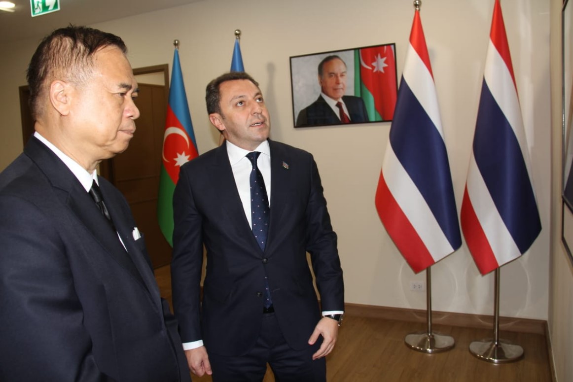 Затем Эльнур Мамедов и его тайский коллега Вижават Исарабхакди перерезали ленту, символизирующую официальное открытие посольства.