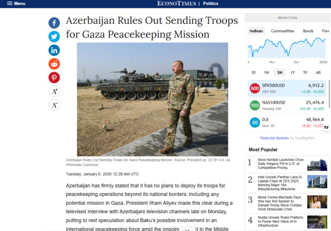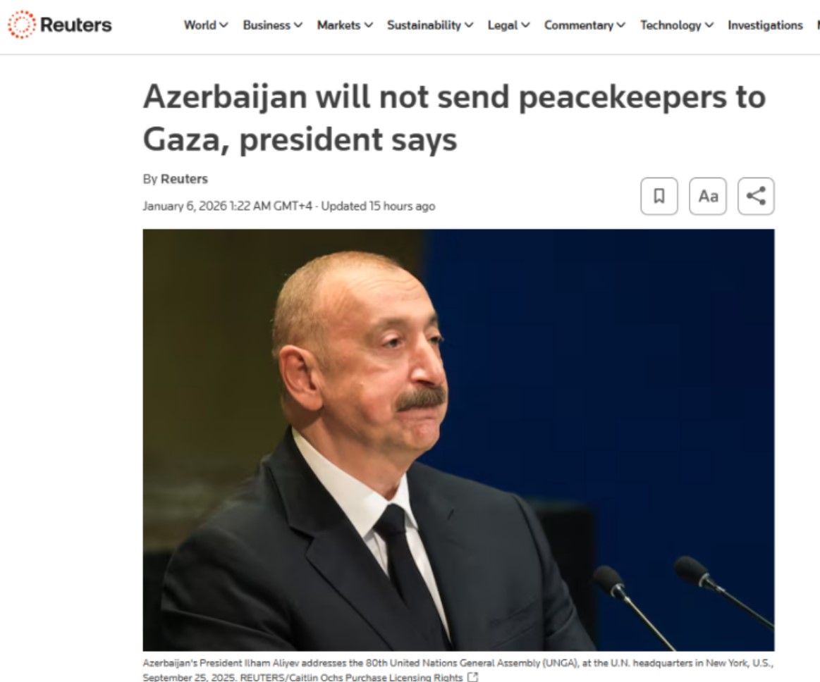В новостях под заголовком «Азербайджан не направит миротворческий контингент в Газу», опубликованная авторитетным агентством Reuters, американскими газетами US News, The Straitstimes, Econotimes, интернет-ресурсом Global Banking and Finance, а также международным аналитическим порталом Al-Monotor, отмечается, что по словам президента Ильхама Алиева, азербайджанские военнослужащие не участвовали ни в каких военных операциях за пределами страны и что это не планируется в будущем. В материале приводятся слова главы нашего государства, которые опровергли ложную информацию по этому поводу: «Мы составили вопросник из более чем 20 вопросов, и передали это американской стороне. Пока эти вопросы не будут разъяснены, никакого участия Азербайджана ни в какой миссии не предусматривается».