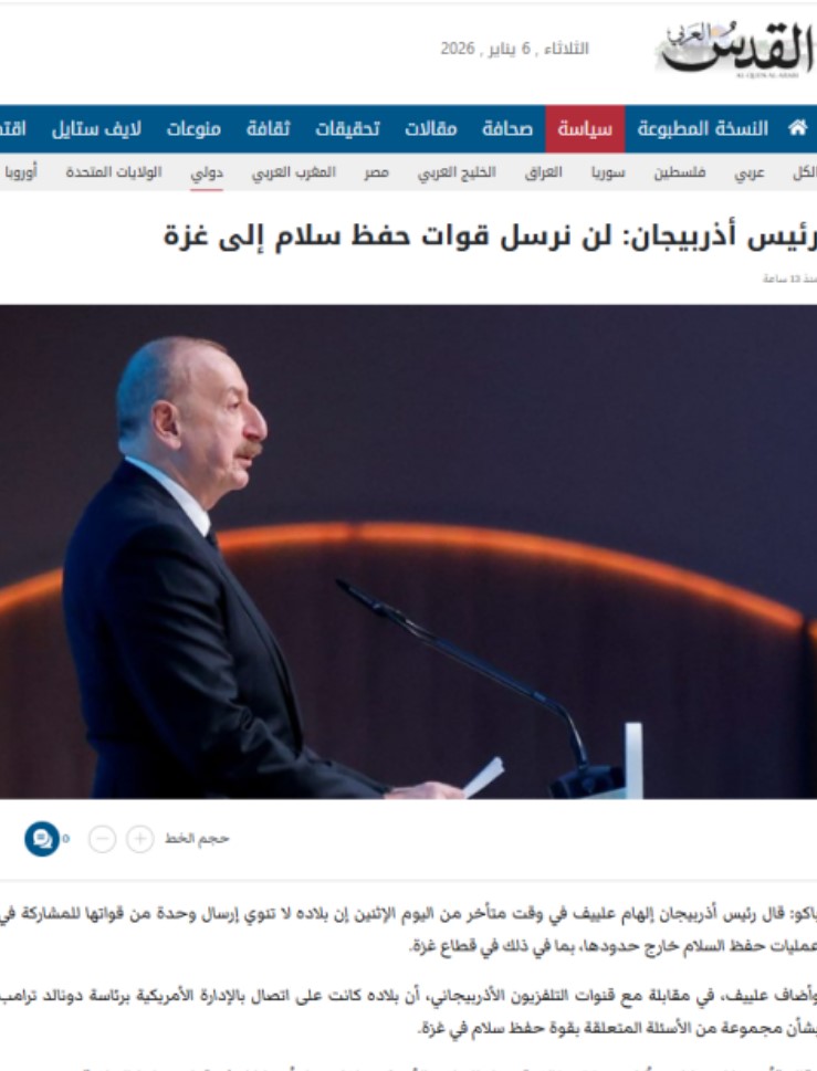 Международный экономический портал Investing.com, израильские газеты The Jerusalem Post, Israelhayom, Time of Israel, русскоязычный портал «Вести Израиль», болгарское издание Dnevnik и греческий интернет-ресурс Skai также опубликовали мысли президента Азербайджана о конфликтах на Ближнем Востоке. В материалах отмечалось, что президент Ильхам Алиев опроверг неверную информацию об отправке миротворцев в сектор Газа и направил обращение из 20 вопросов американской стороне, первому источнику этих новостей, по дипломатическим каналам, а также выразил сожаление по этому поводу.