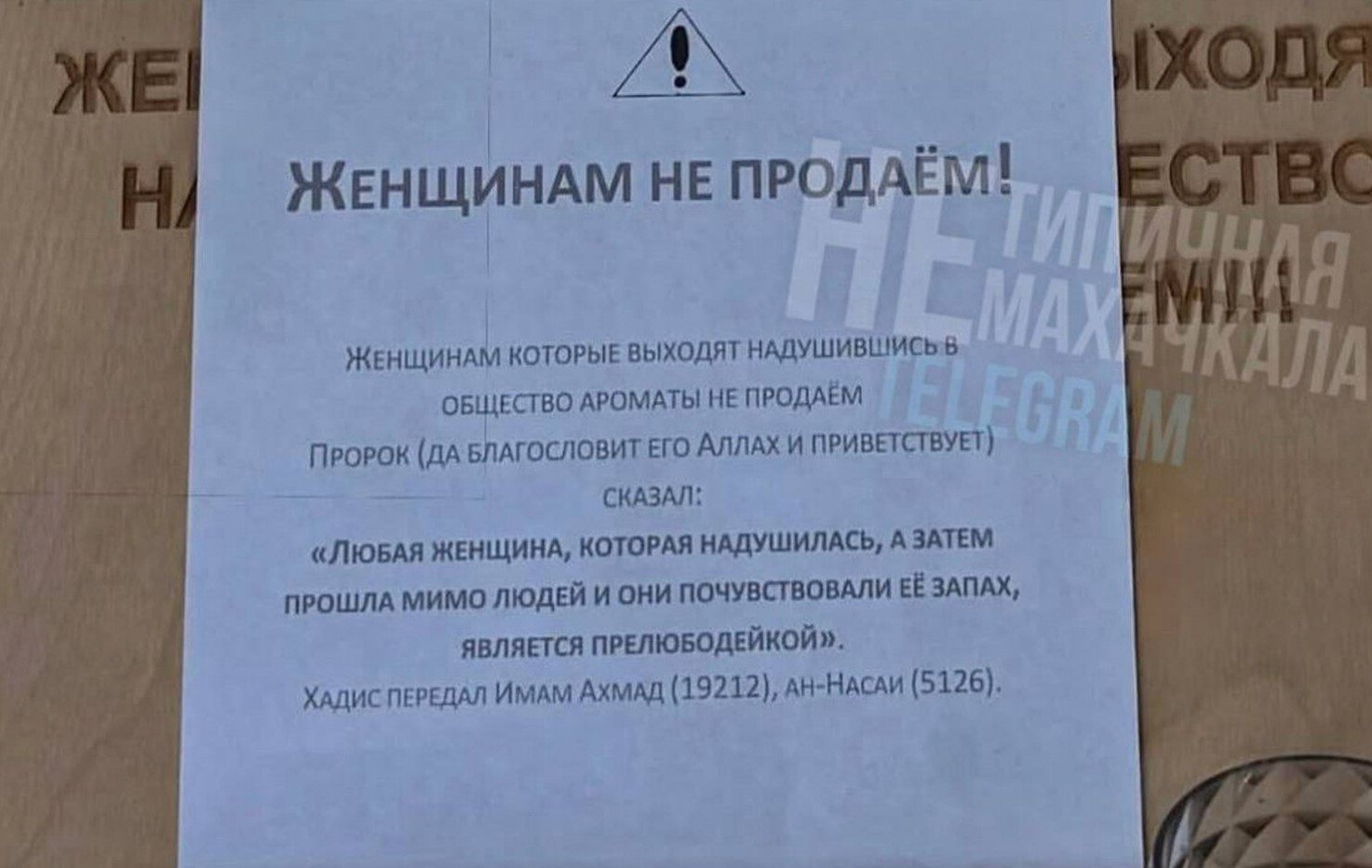 В Дагестане женщинам отказали в продаже духов, сославшись на религиозный запрет. Фотографию соответствующего объявления опубликовал Telegram-канал «Нетипичная Махачкала».