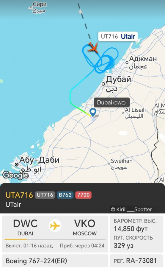 По данным SHOT, рейс авиакомпании Utair подал сигнал 7700 (он обозначает общую аварийную ситуацию) через несколько минут после того, как взлетел из аэропорта Аль-Мактум. Прямо сейчас Boeing 767 кружит над водой в районе города, вырабатывая топливо. В воздухе самолёт находится уже более часа.