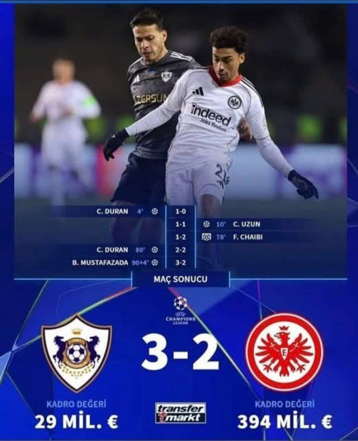 Голы забили: Камило Дуран – дважды, Бахлул Мустафазаде («Карабах»); Джан Узун, Фарес Шайби (с пен.) («Айнтрахт»).