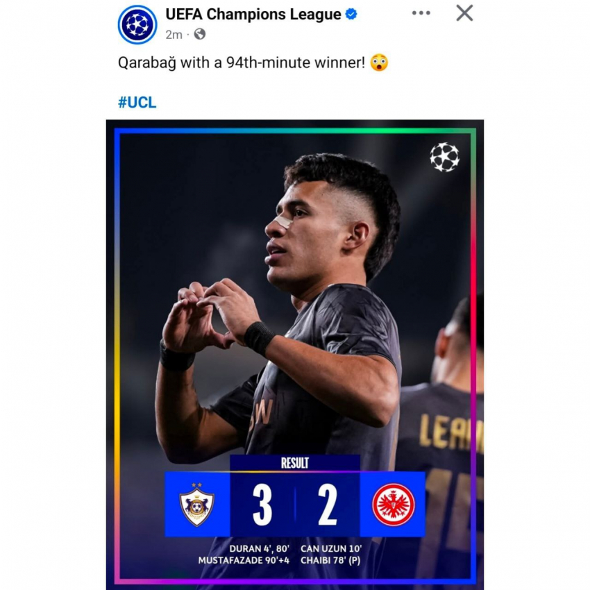На официальной странице Лиги чемпионов UEFA опубликовали пост о победе «Карабаха».