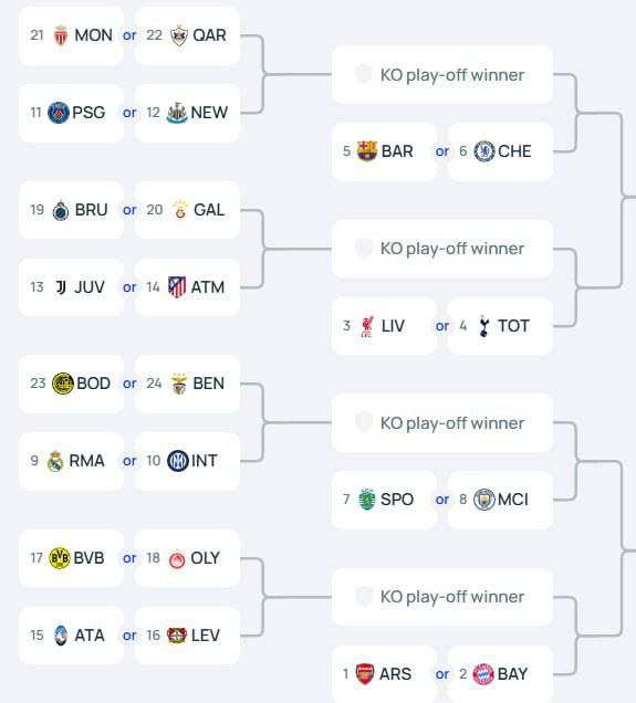 В стыках за право выхода в 1/8 финала сыграют «Реал», «Интер», ПСЖ, «Бенфика», «Галатасарай», «Монако», «Карабах», «Будё-Глимт», «Боруссия», «Олимпиакос», «Брюгге», «Ньюкасл», «Ювентус», «Атлетико» «Аталанта» и «Байер».
