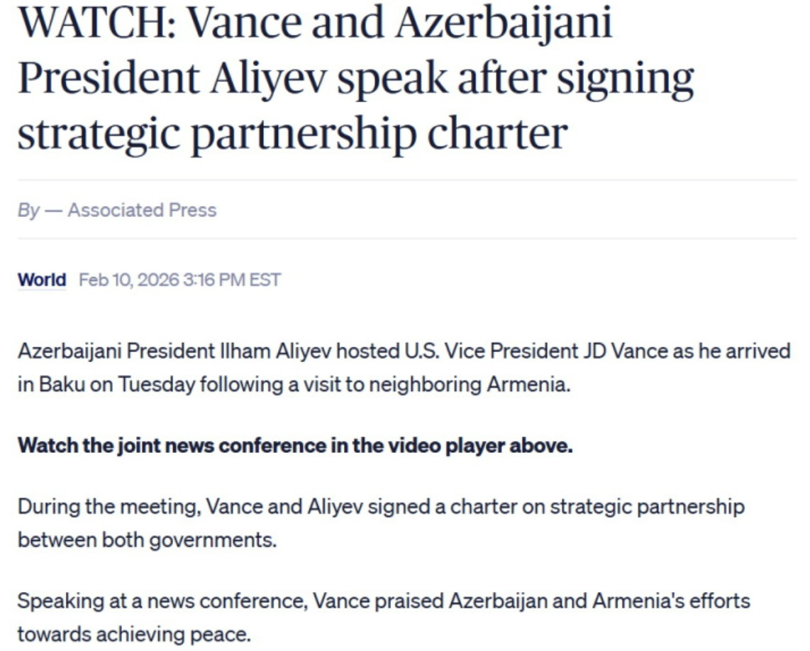 New York Post пишет, что во время заявления для прессы вице-президент Джей Ди Вэнс подчеркнул роль Азербайджана в сотрудничестве с американскими силами в Афганистане, объявил о новой поддержке США в сфере морской безопасности и отметил, что после важной договоренности между Азербайджаном и Арменией, подписанной при участии президента Трампа, партнерство будет способствовать укреплению регионального мира и экономического сотрудничества.