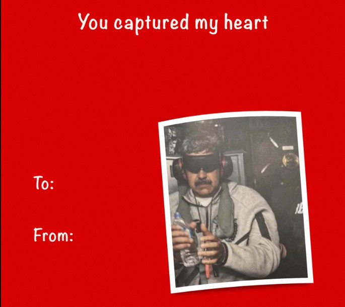 В том же посте была опубликована валентинка с фотографией президента Венесуэлы Николаса Мадуро во время его захвата в начале января 2026 года. «Ты покорил мое сердце», — подписано изображение.