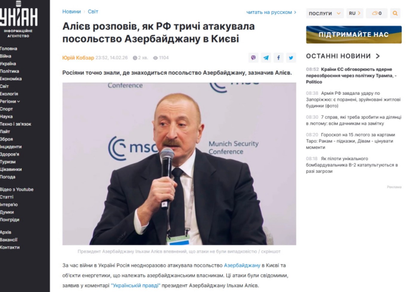 Ведущие медиаресурсы Украины уделили широкое внимание участию президента Азербайджана Ильхама Алиева в Мюнхенской конференции по безопасности, проведенным им встречам и высказанным заявлениям. Об этом сообщает «Азертадж».