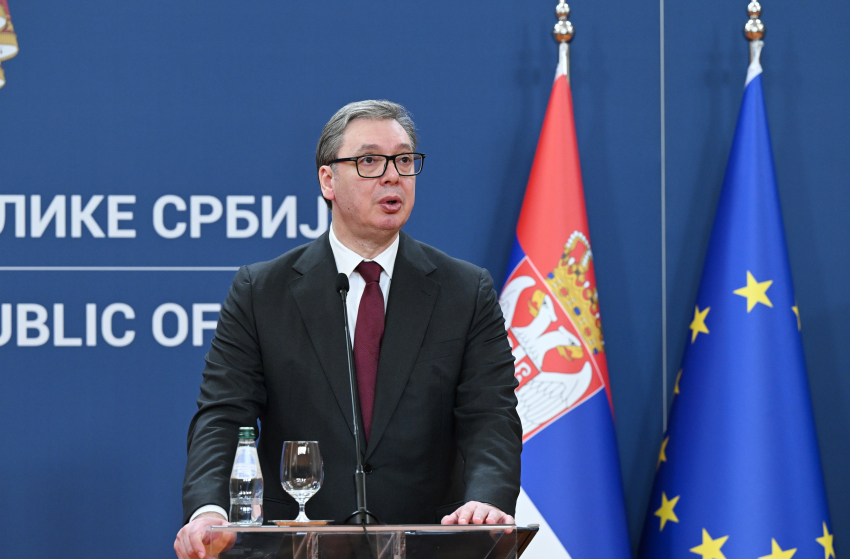Президент Азербайджана Ильхам Алиев и президент Республики Сербия Александар Вучич выступают с заявлениями для прессы.