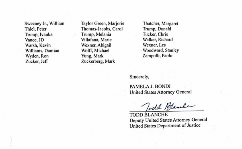Генеральный прокурор США Пэм Бонди опубликовала списки из 300 имен знаменитостей и политиков, упомянутых в файлах по делу финансиста Джеффри Эпштейна, обвиненного в секс-торговле несовершеннолетними.