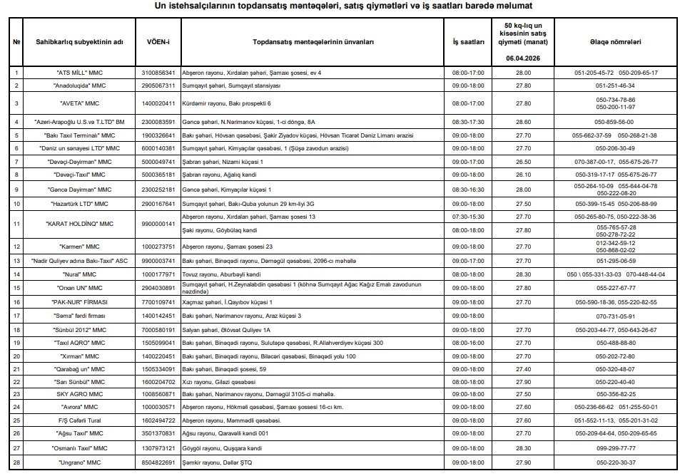 Согласно информации, самая низкая оптовая цена на муку — 26,1 маната — зафиксирована в Шабранском районе, тогда как самая высокая — 28,6 маната — в городе Гянджа.