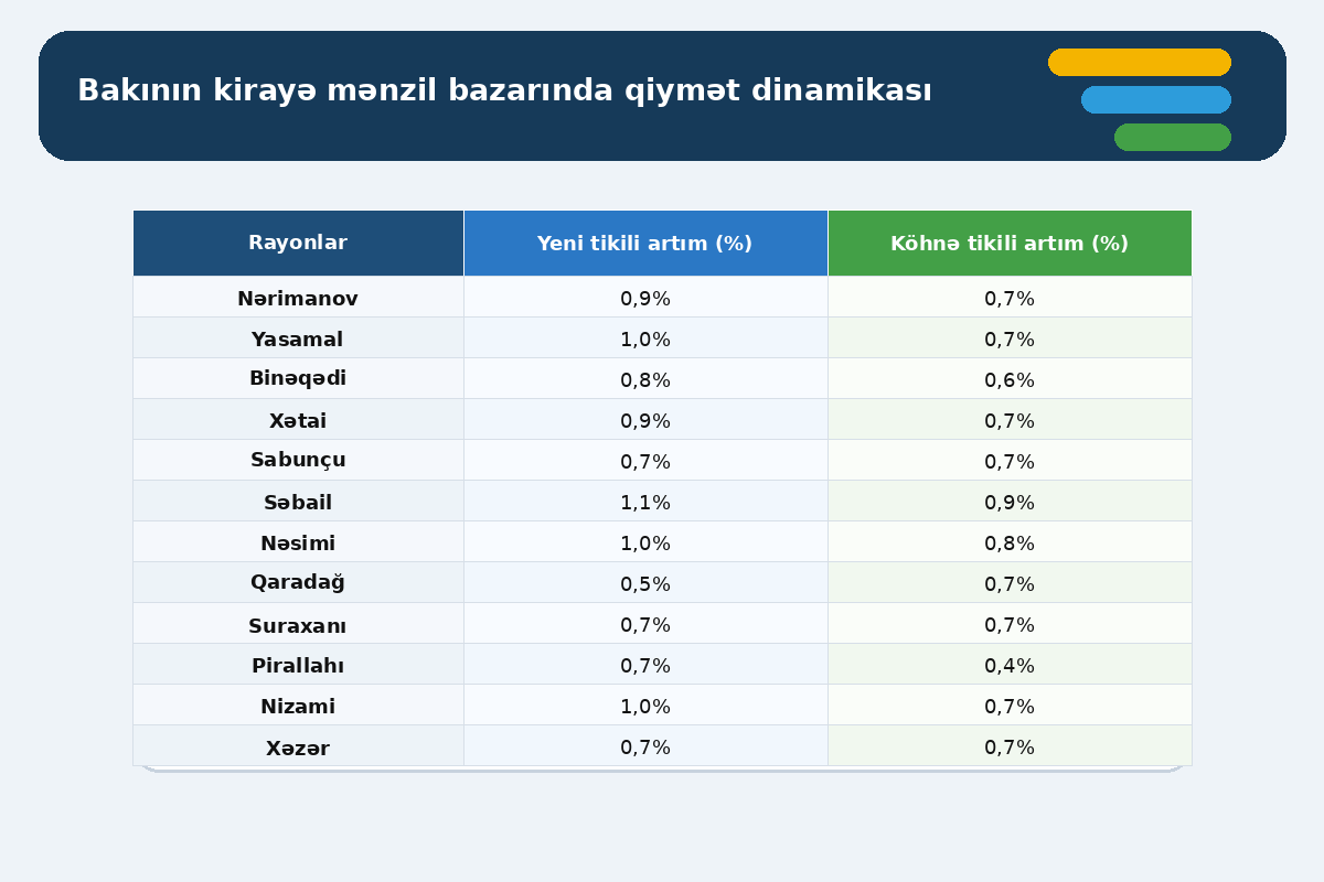 Нариманов, Хатаи, Низами и Бинагади представляют стабильный рынок среднего сегмента с высокой ликвидностью. Переферийные районы, такие как Сураханы, Сабунчи, Гарадаг, Пираллахи и частично Хазар, показывают меньший рост цен, но рынок здесь продолжает развиваться.