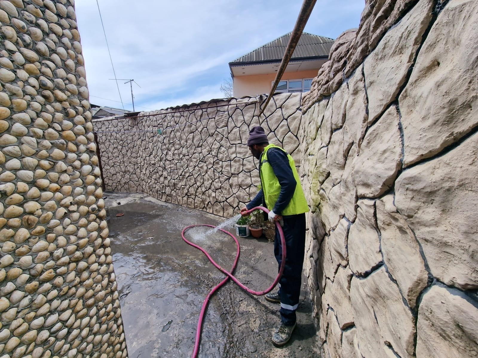 В рамках работ, проводимых коммунальными службами Низаминского района, на территории осуществляется масштабная санитарная очистка. Дворовые участки и проходы очищаются от грязи и ила, затем проводится их промывка.