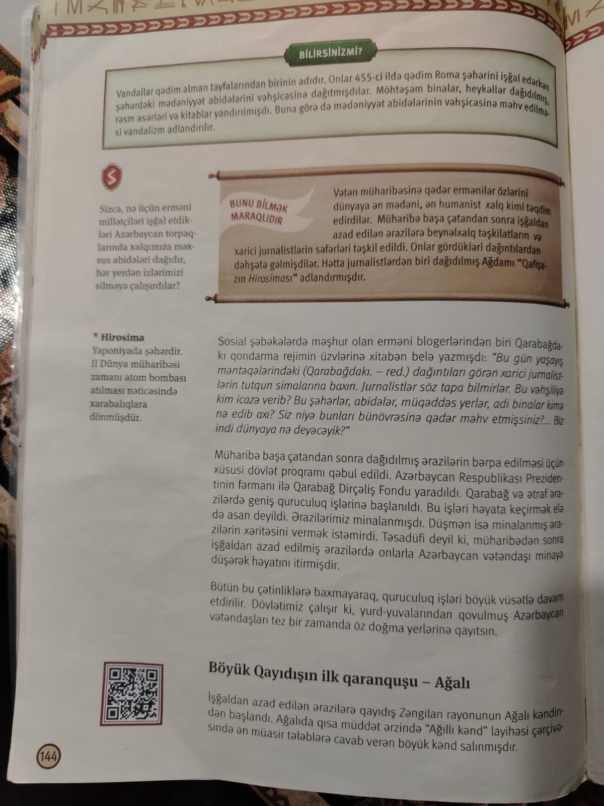 Далее: на странице 144 автор, чтобы донести до ученика весь масштаб причиненного армянскими оккупантами ущерба, для пущей убедительности приводит слова какого-то там «армянского блогера», которого даже не называет: «Один из армянских блогеров, известных в социальных сетях, в адрес преступной хунты в Карабахе написал: «Посмотрите на застывшие лица иностранных журналистов, увидевших руины населенных пунктов в Карабахе. Они не нашлись, что сказать. Кто разрешил это зверство? …что мы теперь скажем миру?»