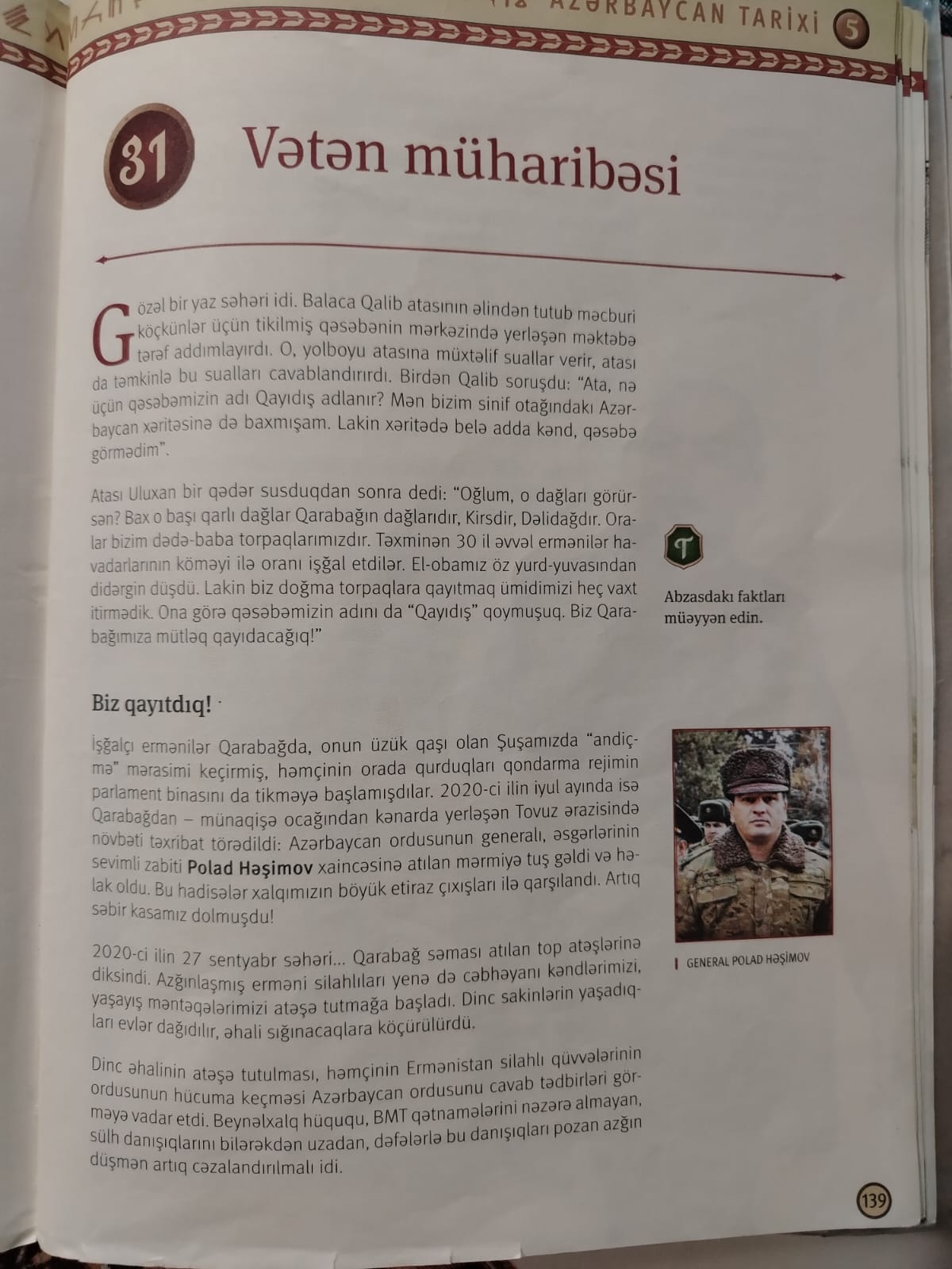 Так, в теме №31 «Отечественная война» говорится об армяно-азербайджанском конфликте. Автор пишет: «Обезумевший враг, не соблюдающий международное право, резолюции ООН, умышленно затягивающий процесс мирных переговоров, неоднократно нарушающий их, должен быть наказан».