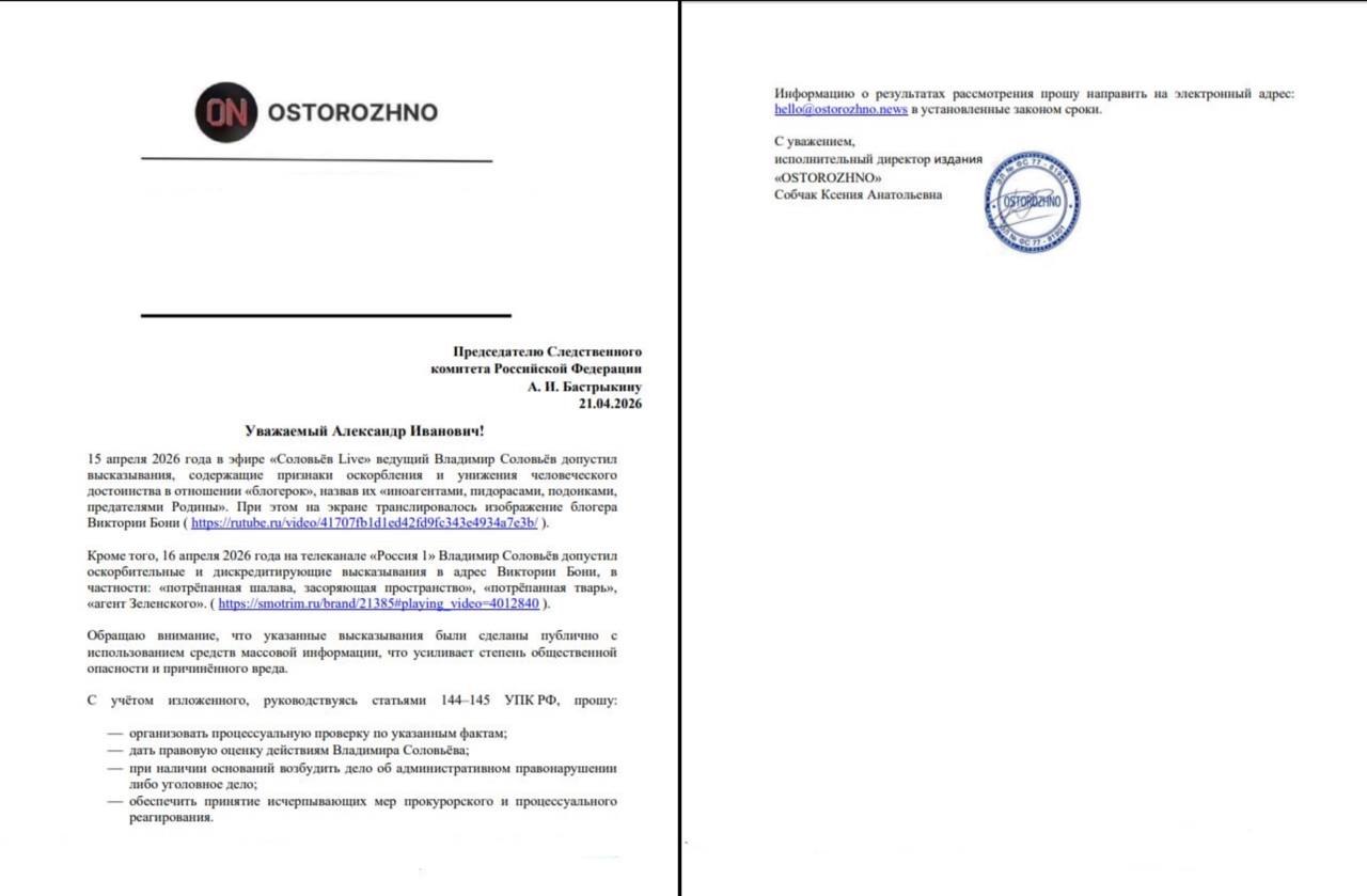 Поводом стали слова Соловьёва о блогере Виктории Боне — в частности, «потрёпанная шалава» и «агент Зеленского».
