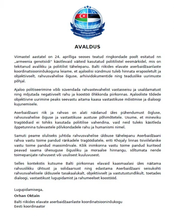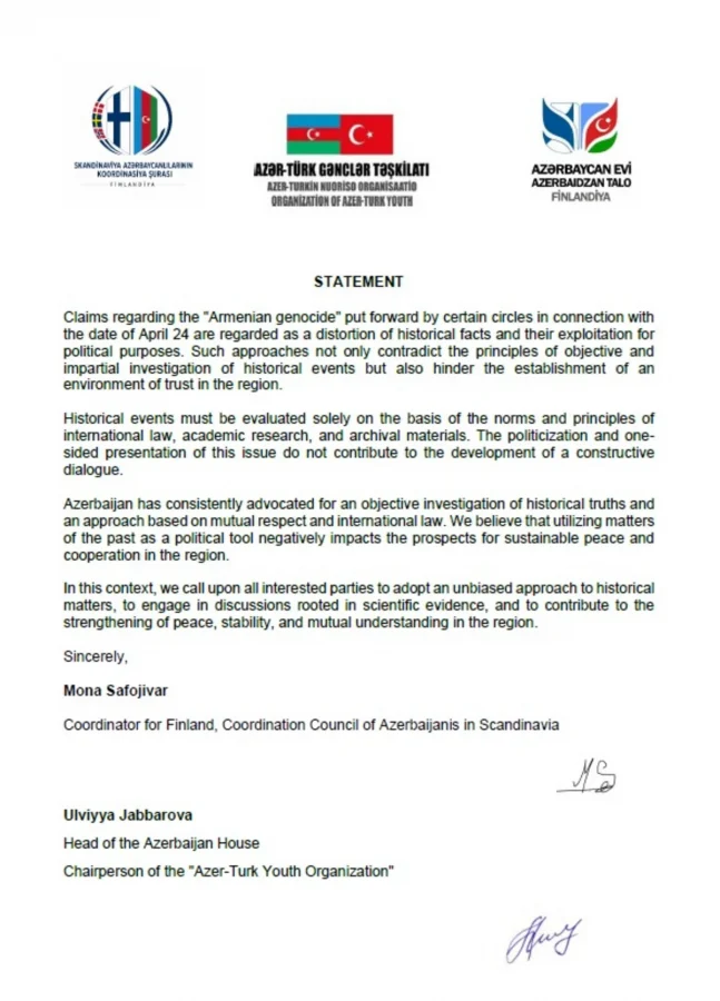 Обращение подписали представители азербайджанских организаций, действующих в разных странах Европы.