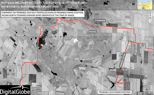 Изображение 4, зафиксировано 23 июля 2014, показывает то, что шесть российских 153мм 2С19 самоходных орудий, расположенны в России около Куйбышево. Этот объект находится в 6,5 километров, к югу от границы Украины, в районе села Червоный Жовтень. Пушки указывают на север, прямо на территорию Украины (обратите внимание на индикатор Севера). Смотрите изображение 5, здесь видно, что эти пушки направлены к украинской территории.